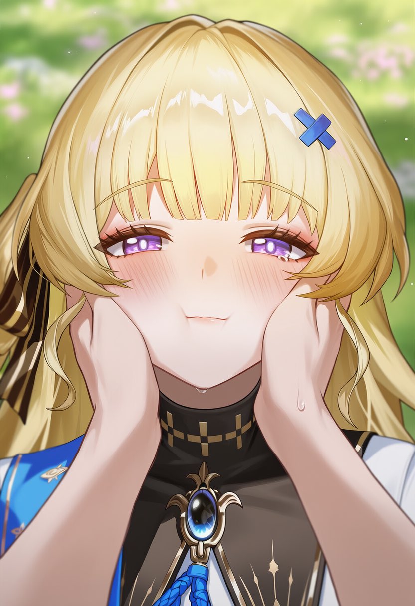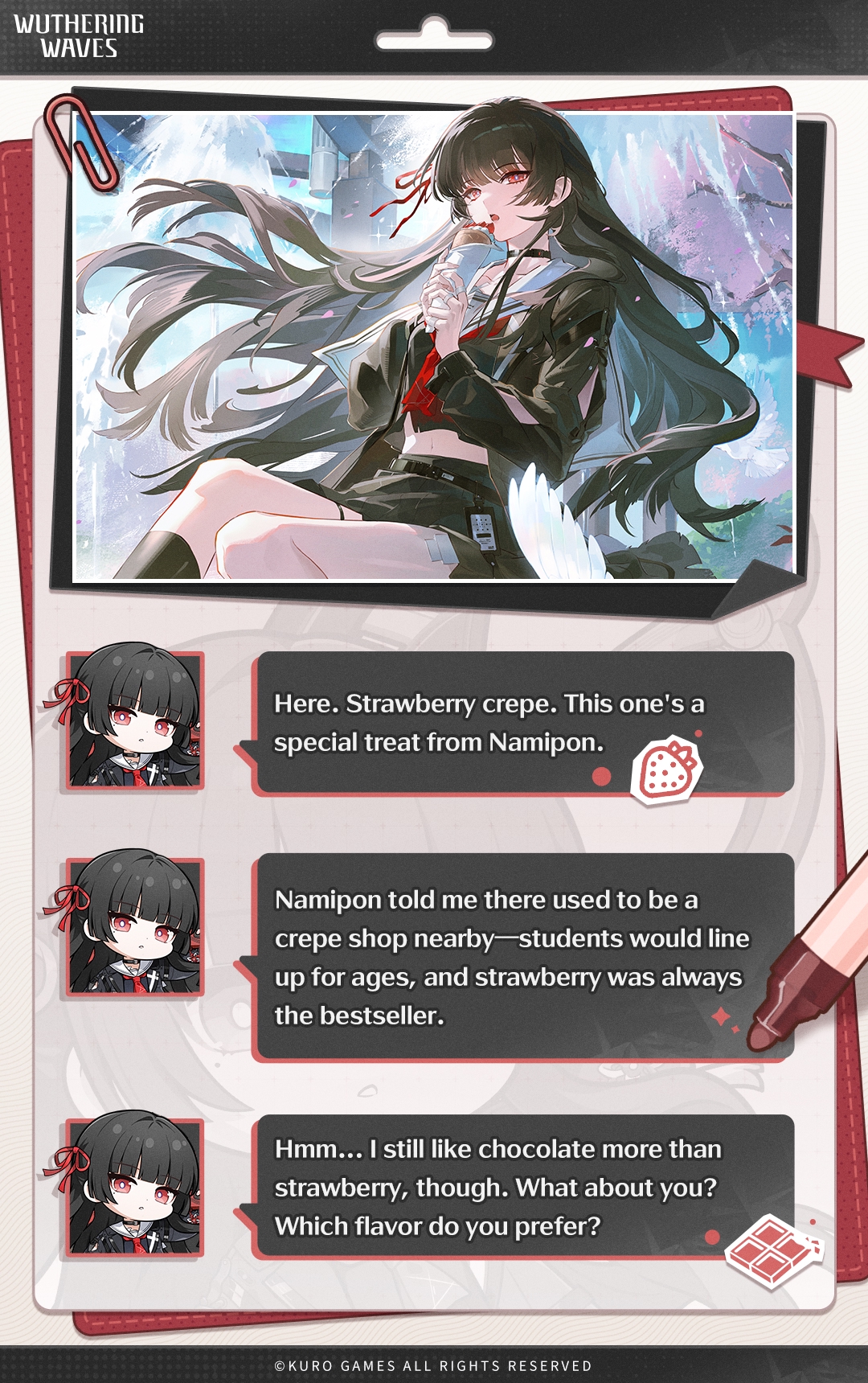 >>5949295 A Stroll Around Honami With Chisa | Fountain Square Even though Honami's golden days have long passed, the Fountain Square still carries its familiar lively charm. The fountain sparkles under the sunlight as Chisa settles herself at the well's edge, then offers you a delicate treat. "Here. Strawberry crepe."