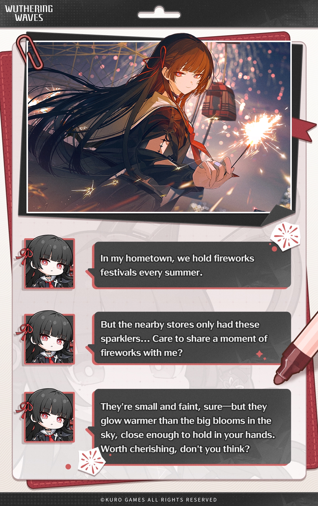 >>5949295 A Stroll Around Honami With Chisa | The Cafe's Rooftop Before you realize it, the sky has already darkened while your small talk with Chisa drifts on atop the cafe. She pauses at the change in light, then reaches into her coat pocket and pulls out a tiny box of sparklers. —"Care to share a moment of fireworks with me?"