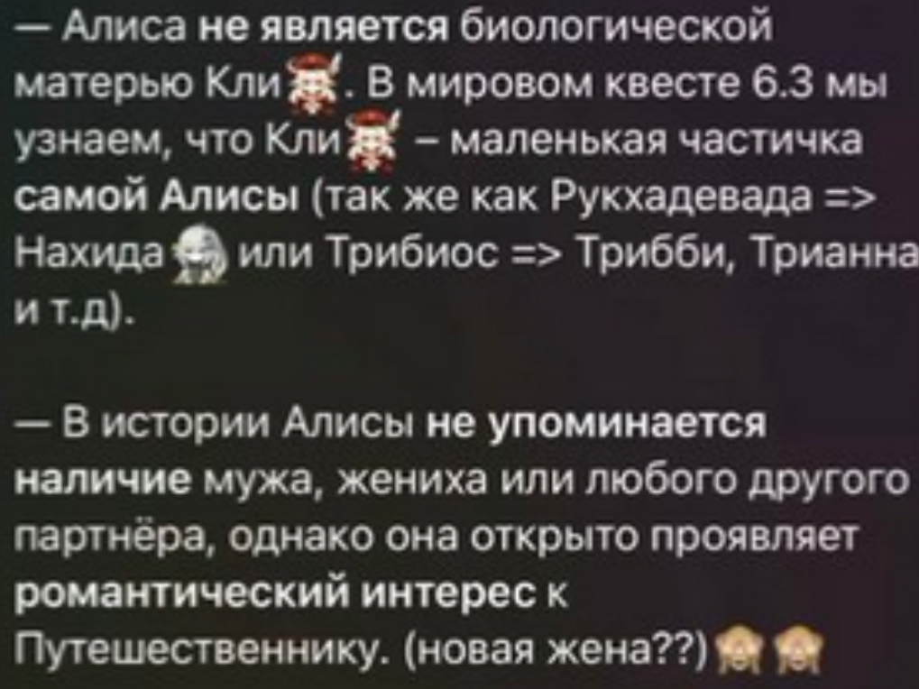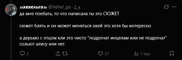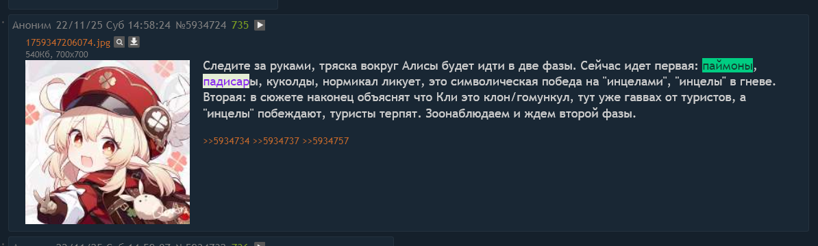 ТГканальчики вбрасывают свои теории по поводу рожавшей и ебавшейся Алисы - аноны горят, плюются, злятся. ТГканальчики вбрасывают свои теории по поводу девственной и нерожавшей Алисы - аноны радуются, хотят крутить, счастливы.