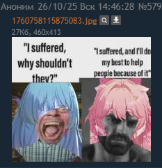 >>5950340 → >Люди разные бывают и разное нравится. Ну это просто универсальнейший прием софистов, да. >Плохим сюжет делает неправильная структура подачи. Плохим сюжет может делать абсолютно что угодно, если этого что угодно оказывается достаточно много. И как раз-таки с подачей у Писевора все нормально, мем про синему не на пустом месте появился, даже я, как главный хейтер по мнению треда, это признаю. А вот с наполнением все очень плохо. О чем я и пишу уже больше года.