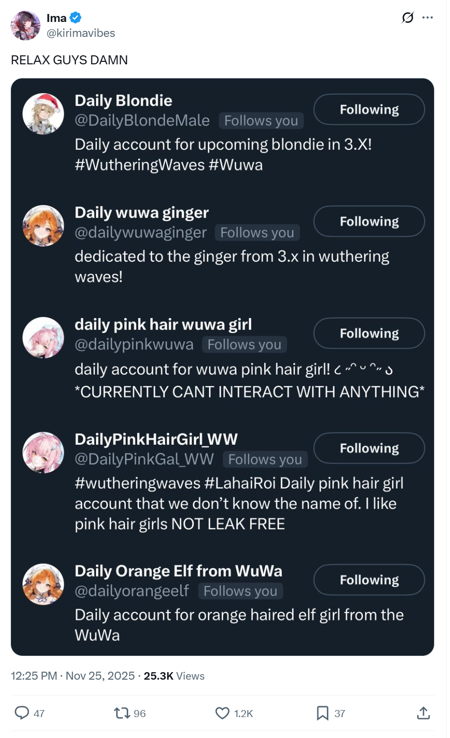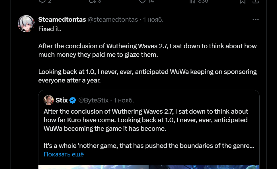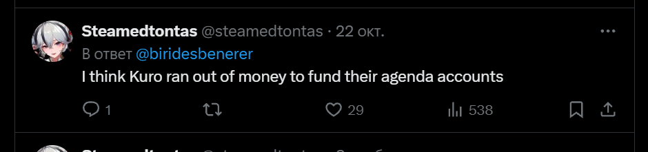 https://x.com/soh_toa/status/1993225745649615053 Сорс этой хуйни кстати паймона из твиттера, лол. Гляньте посты там этого Steamedontas, чистейший курохейт лол, не могу сука с работы нормально ссылку на профиль запостить, запрещенная сеть заблочена.