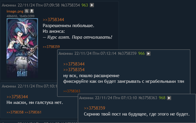 >>5953633 надеюсь они не только братик с сестричкой, но еще и любовники по поводу базовичка опасения, что опять как с брантом сделают и похерят весь характер ради сохранения душевного спокойствия шизиков я конечно тоже шизик, но не настолько дегенеративный, чтобы поверить, что альфач-биджин перед карликом-инсектоидом будет заискивать и кланяться, даже если это гг с суперсилами