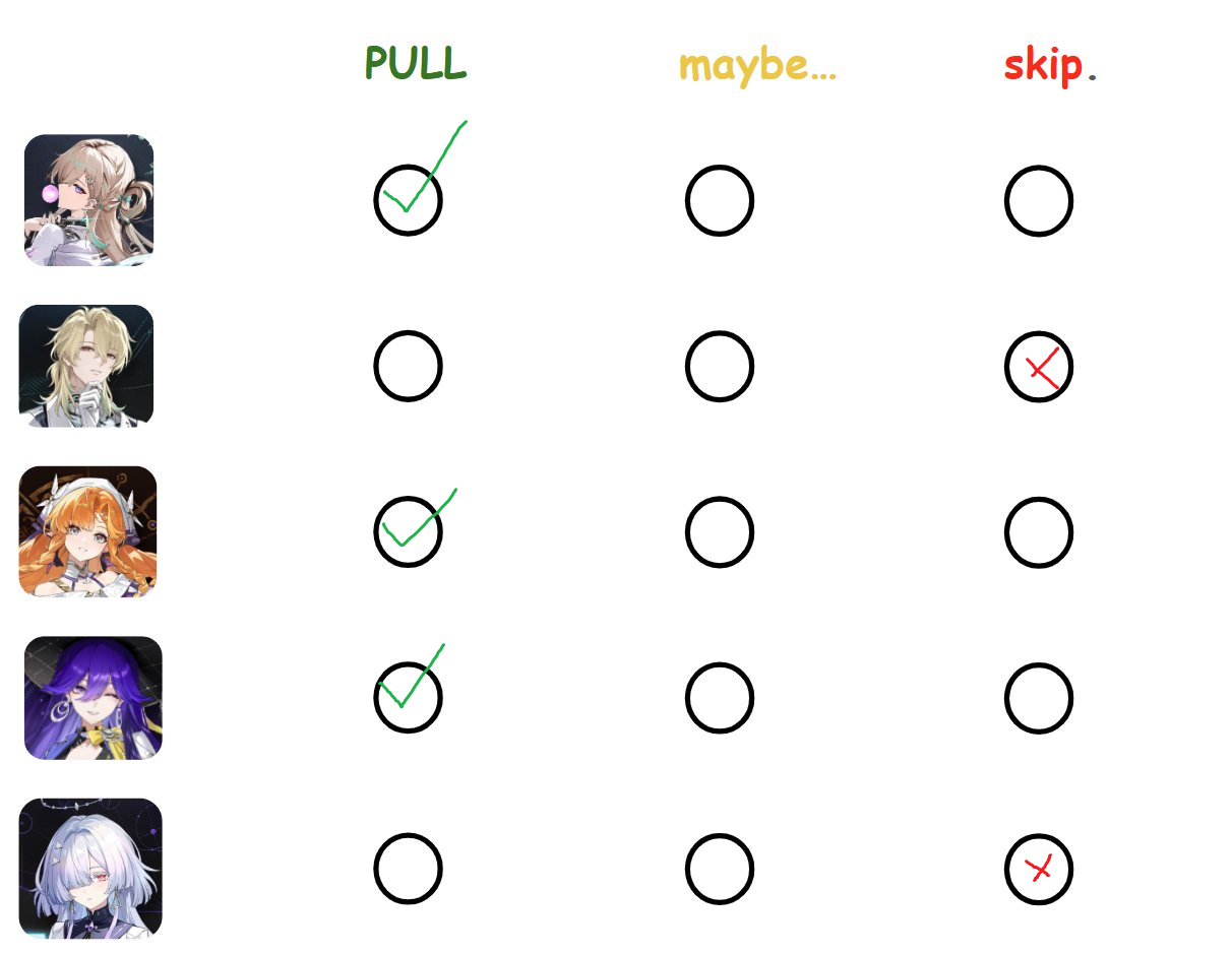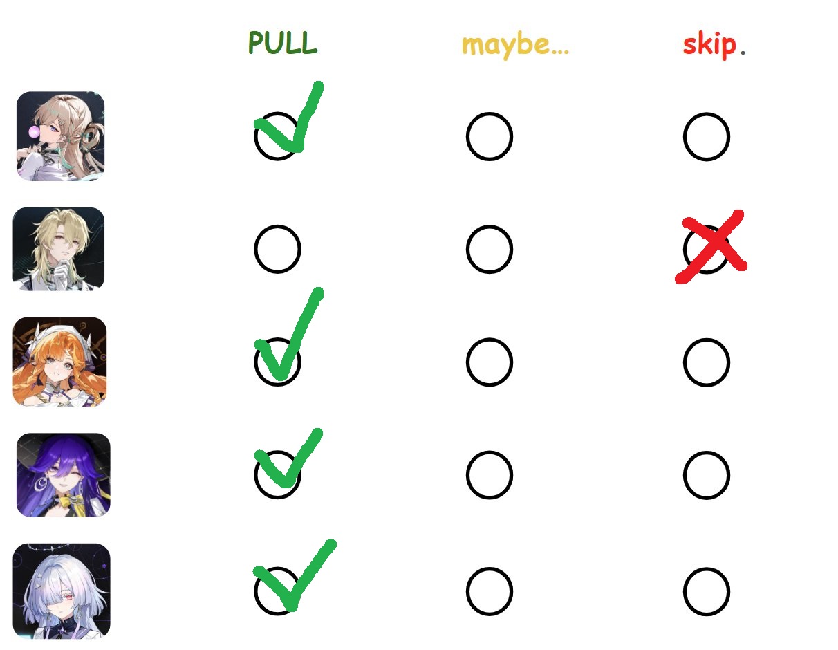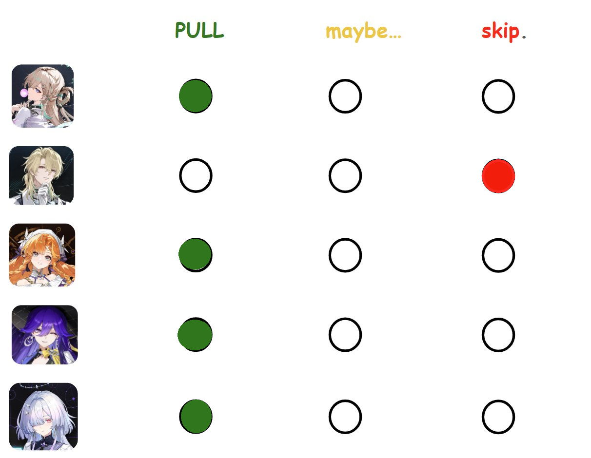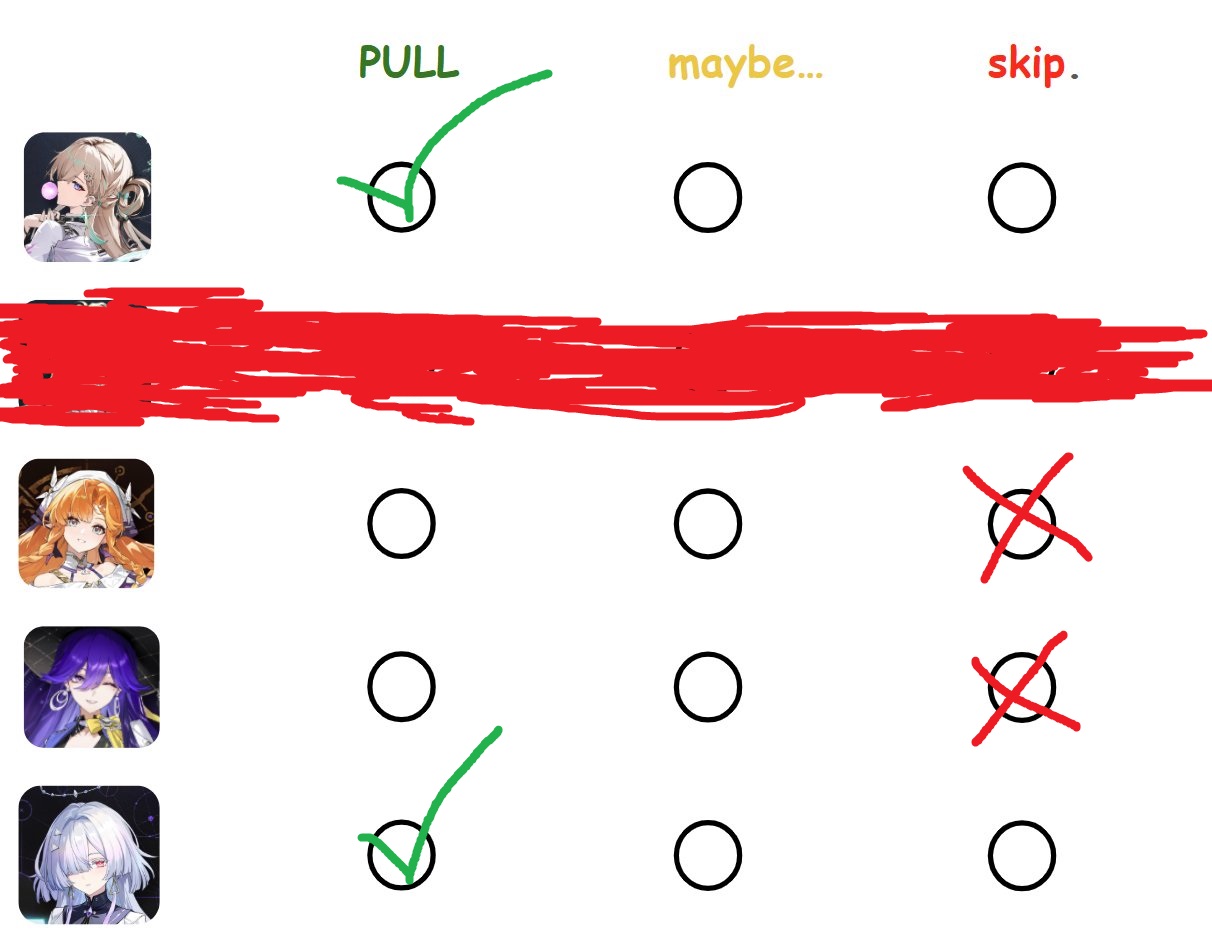 Бля, как же плохо то всё. Не то что бы я надеялся на что то, после Чисы. Но, я реально как дурачок поверил что у аутисточки будет лаконичный чёрно-белый костюмчик. А на деле, какое же говно... Она прям... хуёвая, опять эти висюльки, шторы, ленточки-хуенточки, повсюду. Даже нейро-ноги не такая проблема. Фиолетоволосая, просто рескин Сладкоушки, просто скип, это устаревший дизайн, и опять, нагромождение визуала. Рыжая эльфийка, да просто никакая, она настолько одинаково могла выйти в любой соседней гаче, потому что дизайн максимально общий. максимально дефолтный. Ну и остаётся блонди, но опять насрали курткой, под юбкой гигазаливка будет. Я просто даже хз, крутить или нет. Будет зависеть от элемента. Вообще, всё аэро инстаскип, Катьку и Юнону перебить невозможно до ЕОСа. На синему и игру это не повлияет, но думаю можно больше не заносить, кроме как на подписку. Уже 2-3 патча скипов намечается. Если только докручивать консты, что бы старых персов в актуалочке держать.