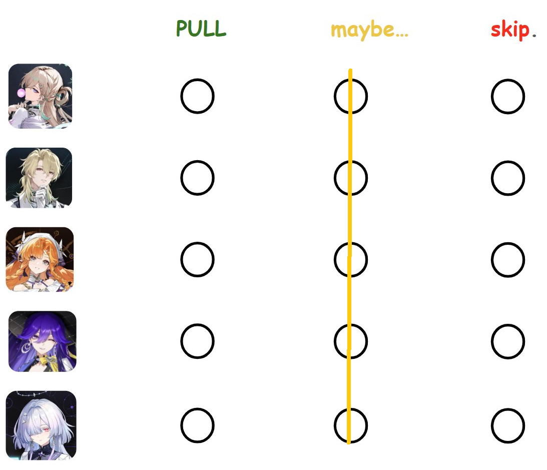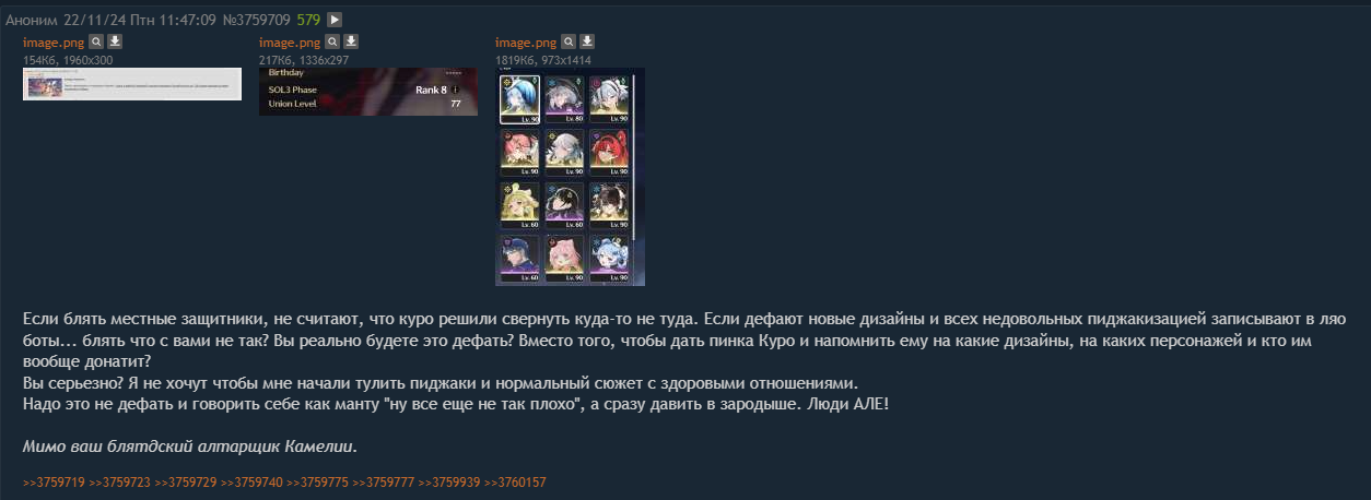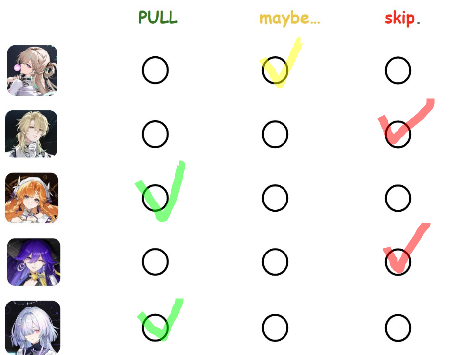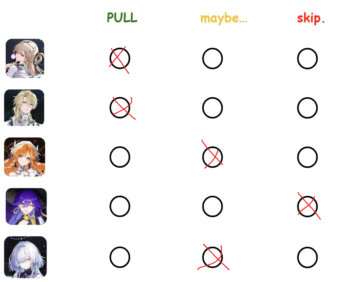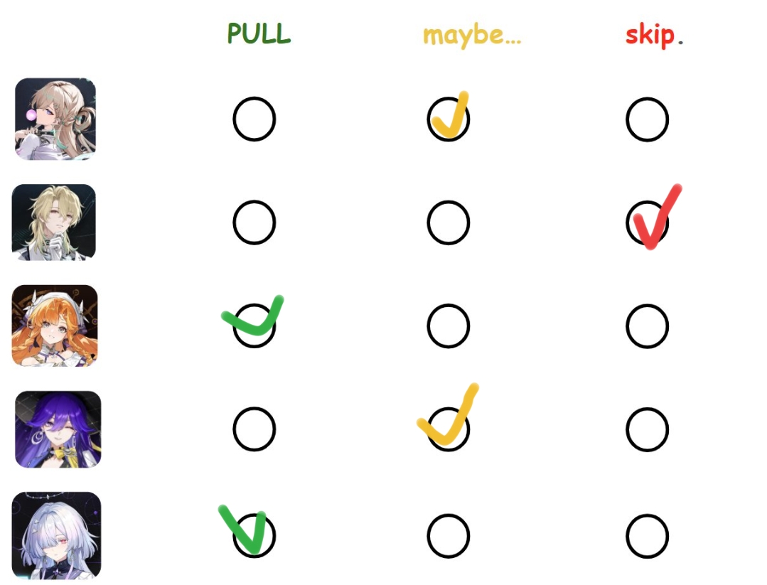 Бля, как же плохо то всё. Не то что бы я надеялся на что то, после Чисы. Но, я реально как дурачок поверил что у аутисточки будет лаконичный чёрно-белый костюмчик. А на деле, какое же говно... Она прям... хуёвая, опять эти висюльки, шторы, ленточки-хуенточки, повсюду. Даже нейро-ноги не такая проблема. Фиолетоволосая, просто рескин Сладкоушки, просто скип, это устаревший дизайн, и опять, нагромождение визуала. Рыжая эльфийка, да просто никакая, она настолько одинаково могла выйти в любой соседней гаче, потому что дизайн максимально общий. максимально дефолтный. Ну и остаётся блонди, но опять насрали курткой, под юбкой гигазаливка будет. Я просто даже хз, крутить или нет. Будет зависеть от элемента. Вообще, всё аэро инстаскип, Катьку и Юнону перебить невозможно до ЕОСа. На синему и игру это не повлияет, но думаю можно больше не заносить, кроме как на подписку. Уже 2-3 патча скипов намечается. Если только докручивать консты, что бы старых персов в актуалочке держать.