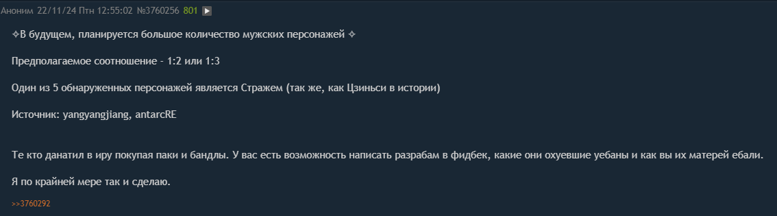 А так, лучше бы с ф2п слезли и донатили. А то лайками все показывают как нужны мужчины, а когда дело доходит до того, чтобы проголосовать рублем, так сказать, сразу "чукча не кит, чукча ф2п".