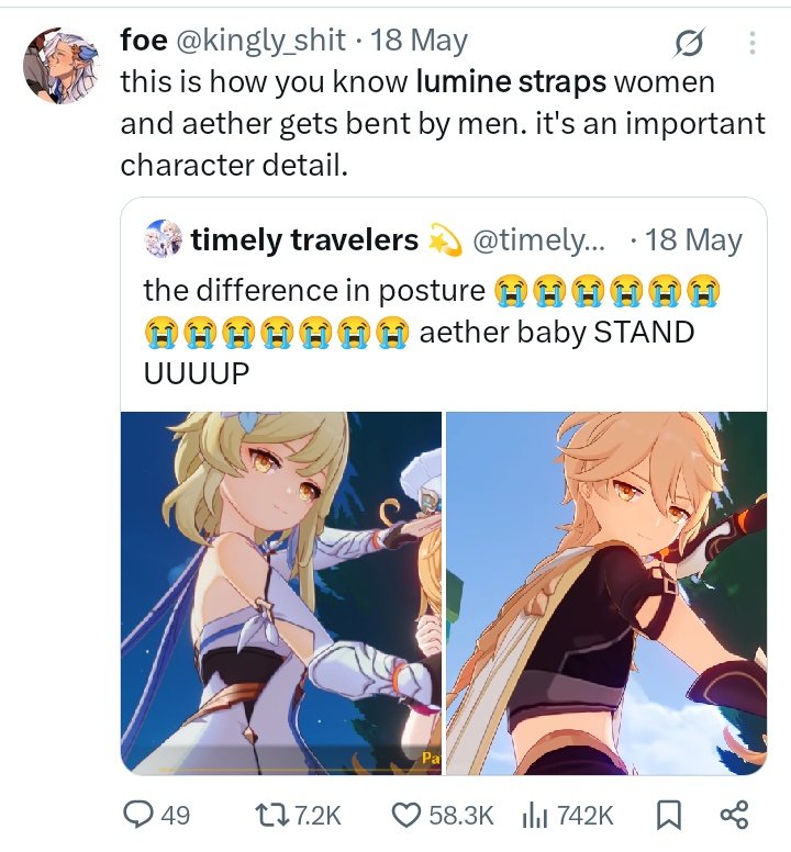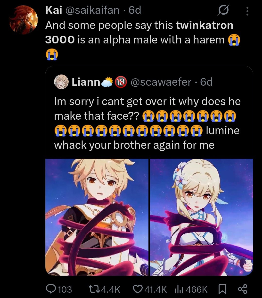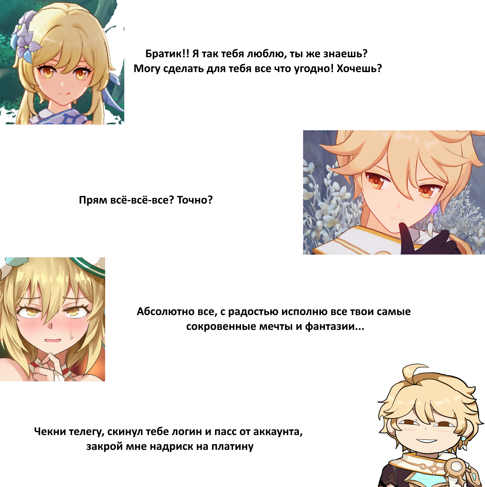 >>5953571 ОДНОКЛАССНИЦЫ СПРАШИВАЮТ "СЫЧУШ, ВО ЧТО ТЫ ИГРАЕШЬ?" @ "ДА В ГЕНШИН ИМПАКТ, МАШ, ТАМ ДЕВОЧКИ КРАСИВЫЕ, МИР КРАСИВЫЙ" @ ВЕЧЕРОМ ОДНОКЛАССНИЦА РЕШАЕТ ПОСМОТРЕТЬ, ЧТО ЗА ГЕНШИН ИМПАКТ ТАКОЙ @ НА ЭКРАНЕ ВМЕСТО ДЕВОЧЕК ДВА ПАЦАНА В ШТАНАХ