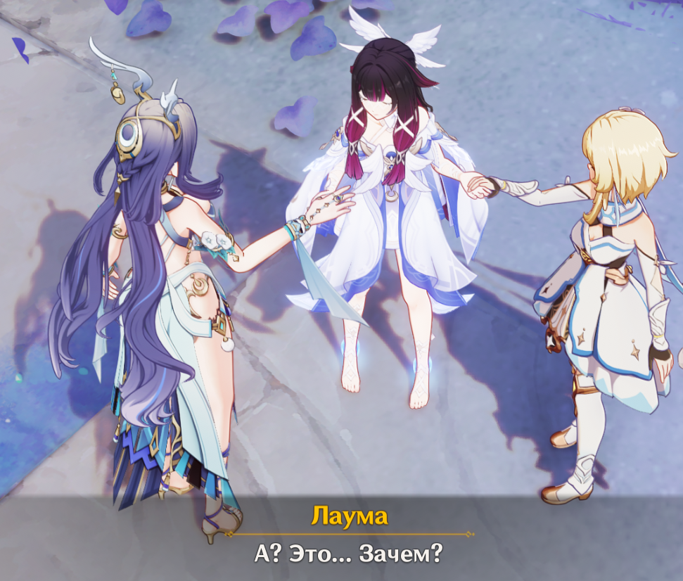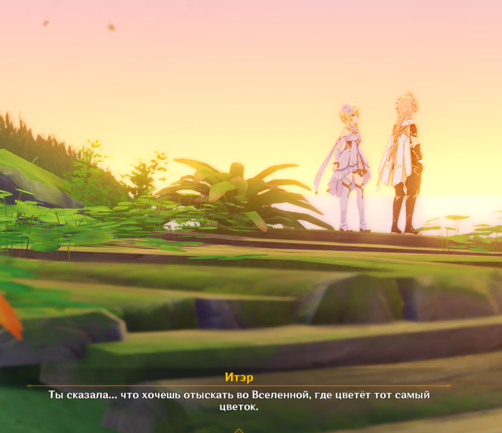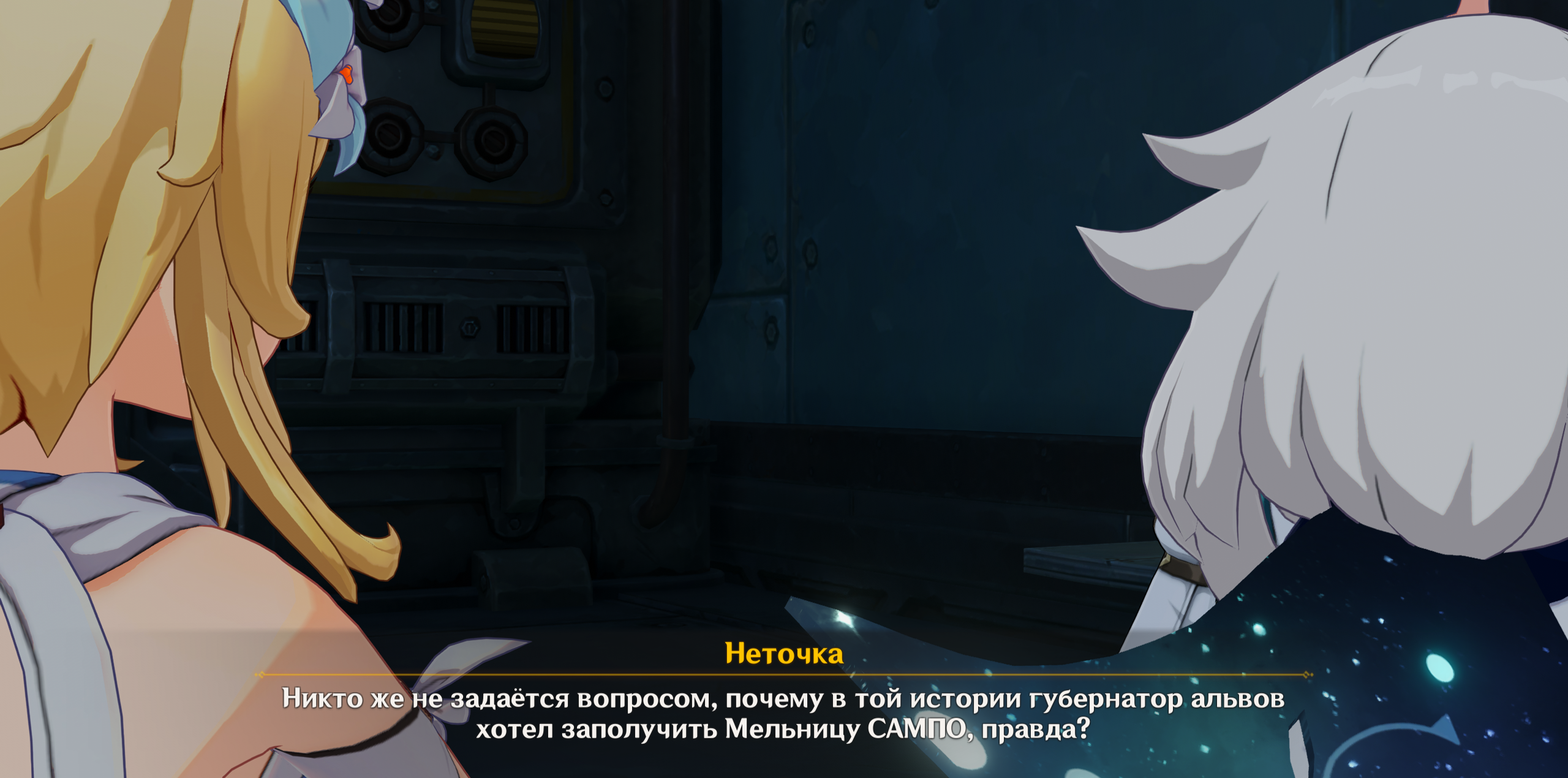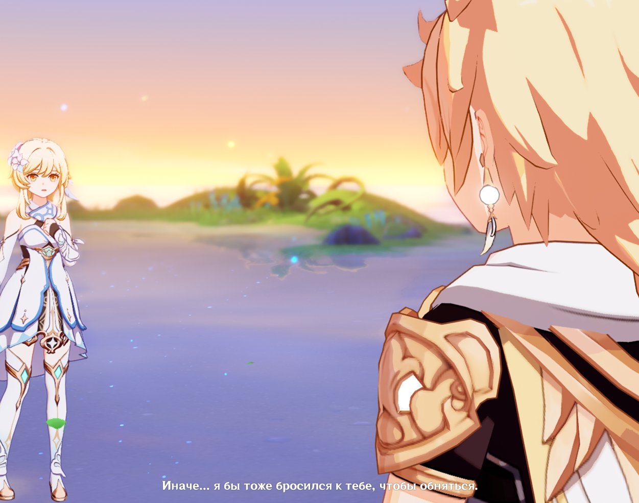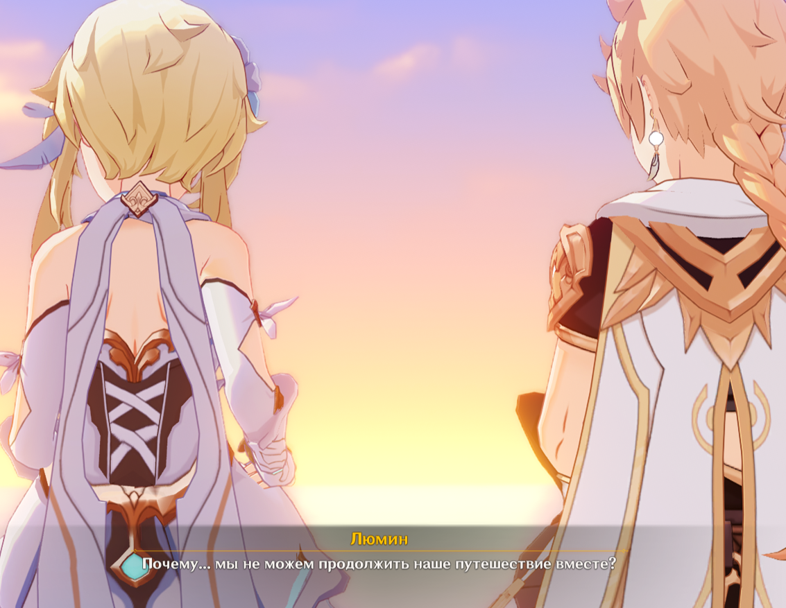 Не ну красивая сцена, тут не поспоришь... Во-первых, меня переименовали и действительно впервые по имени назвали - интересный ход разрабов. А во-вторых, я таким же вопросом задаюсь, каким и Люмин. Ну серьёзно, что мешает близнецу просто из портала выпрыгнуть перед ГГ и сказать: -"Брат/Сестра, пойдём кошмарить Небесный Порядок вместе!" и протягивает руку... В чём сложность-то?
