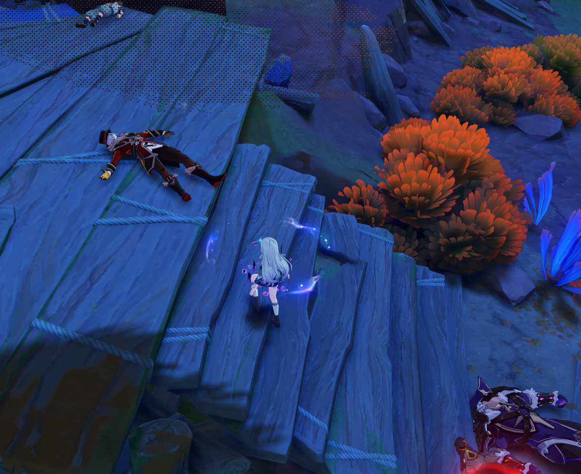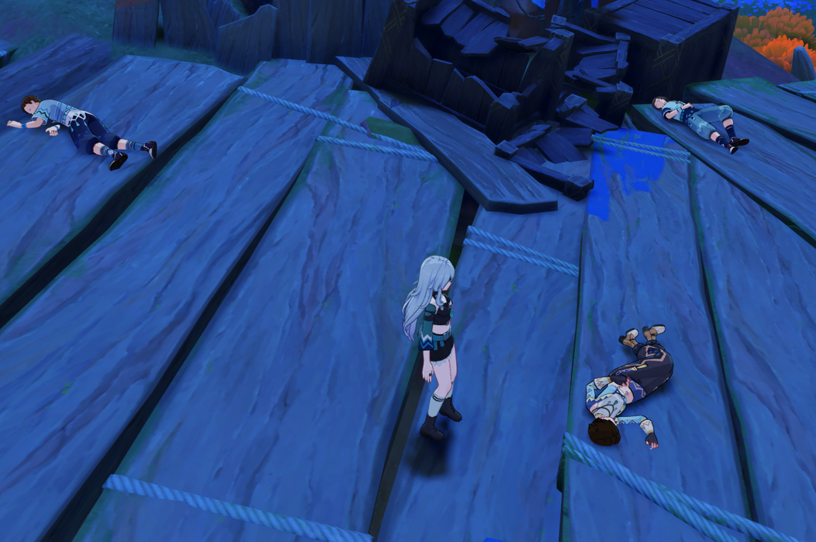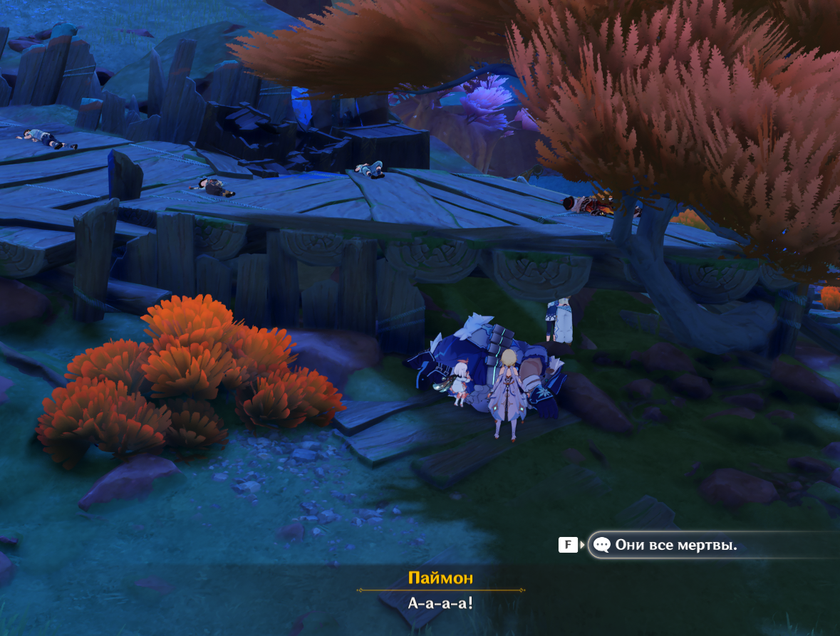 Я пришёл, а там трупы... и мёртвые фатуи, что видимо пытались их защитить. Но вот этот синий фатуй на четвёртом пике, он лежал у подмостков, в которых прятались два выживших. Своим телом зищитил.