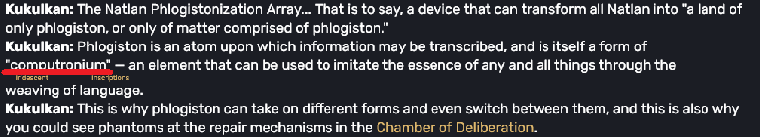 >>5965455 >флогистон первооснова энергии Твои домыслы. ИРЛ компьютрониум это теория о программируемой материи, и вообще энергия = материя если знать "формулу" и соответственно вопрос о первооснове теряет смысл т.к. без "информации о структуре" все квантовая пена или энергия. Китаец банально спиздил это напрямую в игру, цитата: Phlogiston is an atom upon which information may be transcribed, and is itself a form of "computronium" — an element that can be used to imitate the essence of any and all things through the weaving of language.