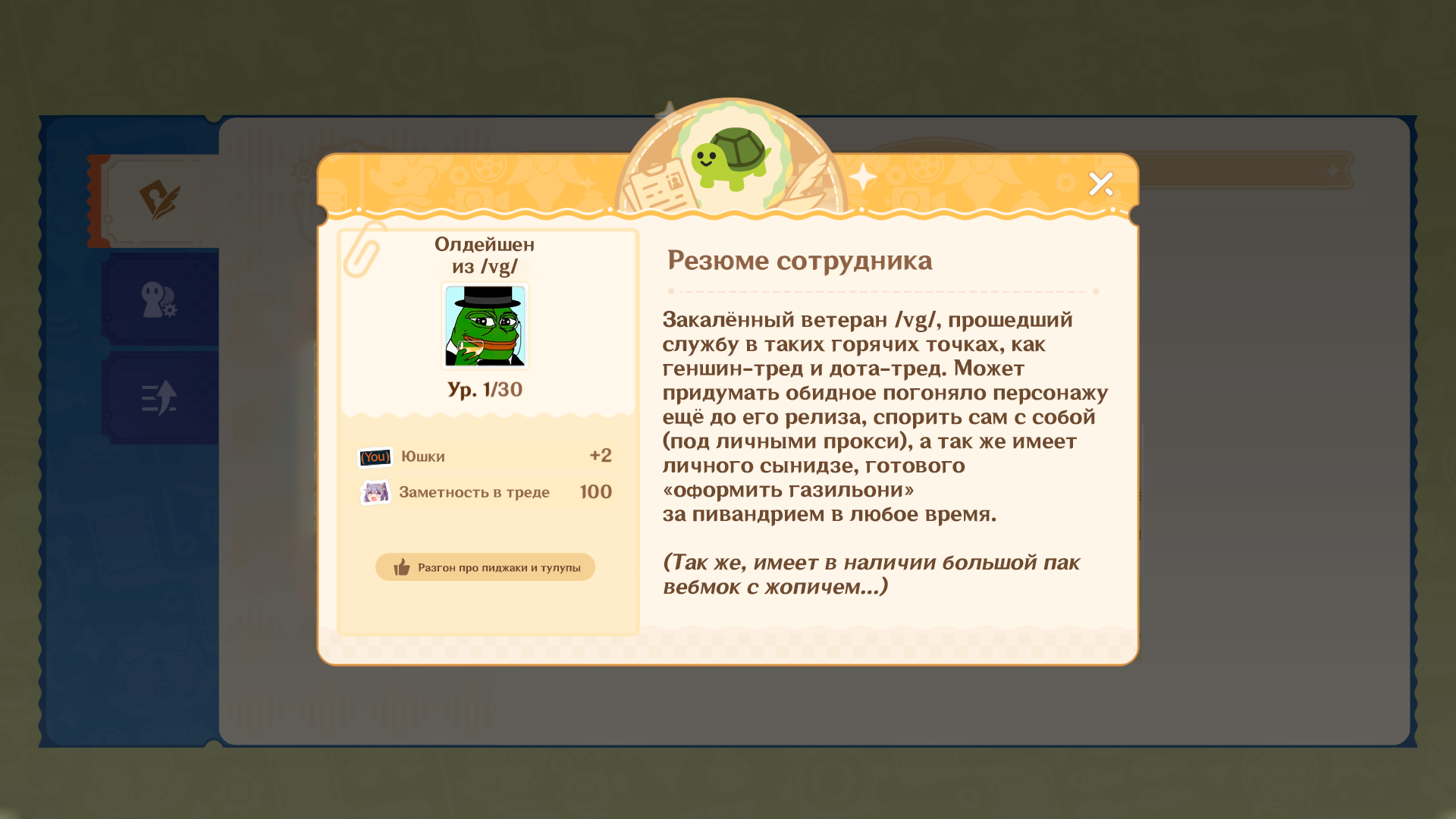 >>5966616 >официальная переписка Про соразмерность слыхал? Это часть дипломатического этикета. Переписка может быть между Снежной и Фонтейном, например, да и то - прислали Арлекино. Тут к сектантам прислали двух мужичков, вот и делай выводы. >всрала битву Вобле Вообще-то по лору они аж штурмом взяли Иназумскую столицу, но жирный Сяо так хорошо написал (и показал) сюжет что этого никто и не заметил. 3ато все помнят как Байда прибежала на помощь всратоцумцам в катсцене посреди сюжета и как уже потом, после архонтского квеста, был подписан "мир". Повтряю - Иназума это шидевор говнописанины от Сяо.