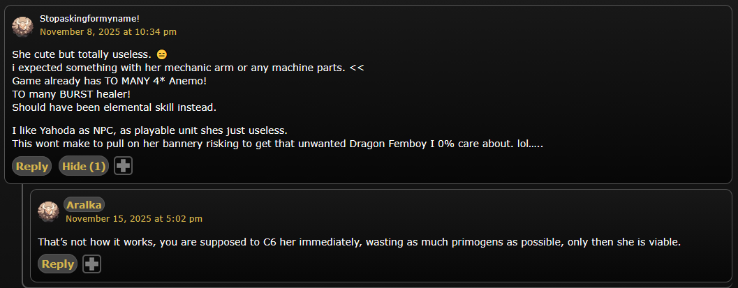 Подгорел с сегодняшнего опроса. «А почему это вы не играете в Милиастру, вам в Геншин не хочется играть?! оО» Да блять, мне как раз в Геншин и хочется играть, а не в корявое подобие роблокса. Если б хотел поиграть в роблокс - играл бы в него. Если б в три в ряд, веселую ферму, еще какую-то хуиту - то играл бы в игры, определяющие эти жанры, где все это на порядки лучше реализовано. Каким долбоёбом надо быть, чтоб этого не понимать? Люди пришли играть в Геншин, дай им блять Геншина, сука, то, ради чего они пришли и остались. А не три в ряд и не веселую ферму, и уж точно не блядский кастрированный роблокс.