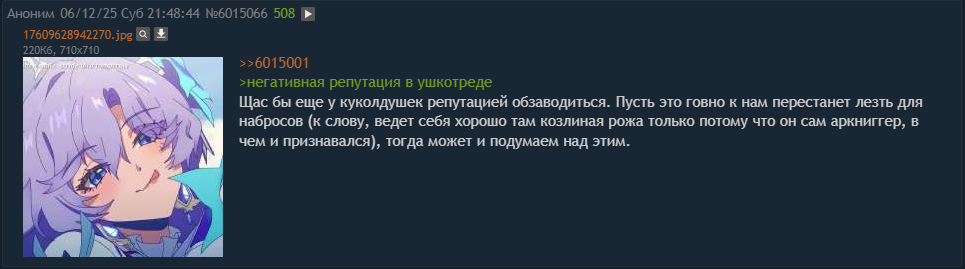 >>6034506 Всё верно пишешь. Плюс ещё ритуальные посты типа "споки ноки". В этом говне весь ушкотред. А когда я пытаюсь развести интересную дискуссию, меня называют геншиненком и троллем.