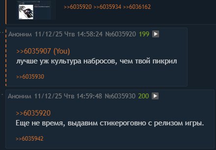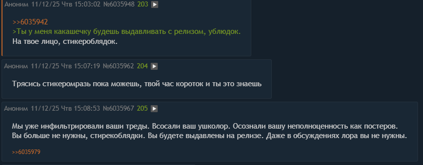 Вот примерно так и выглядит обычное общение стикеродебилов, 2-3 слова и картинка для внимание-блядства, ведь так не понятно кто есть кто, общаются же как нпс. Ноль смысловой нагрузки, ноль общения по теме треда, ноль уважения к другим участникам треда. На релизе игры, необходимо давить этих упырей как говно, выдавить к ебени матери их из информационного поля, пусть сидят и чатятся в калтактике