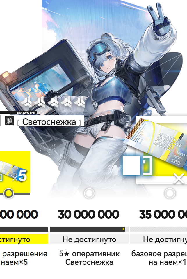 Когда будут достигнуты глобальные цели предрегистрации и набрано необходимое число подписчиков в наших соцсетях, вы получите следующие награды: 5★ оперативник Светоснежка, базовое разрешение на наем х20 и 5★ оружие «Финальный вызов»!