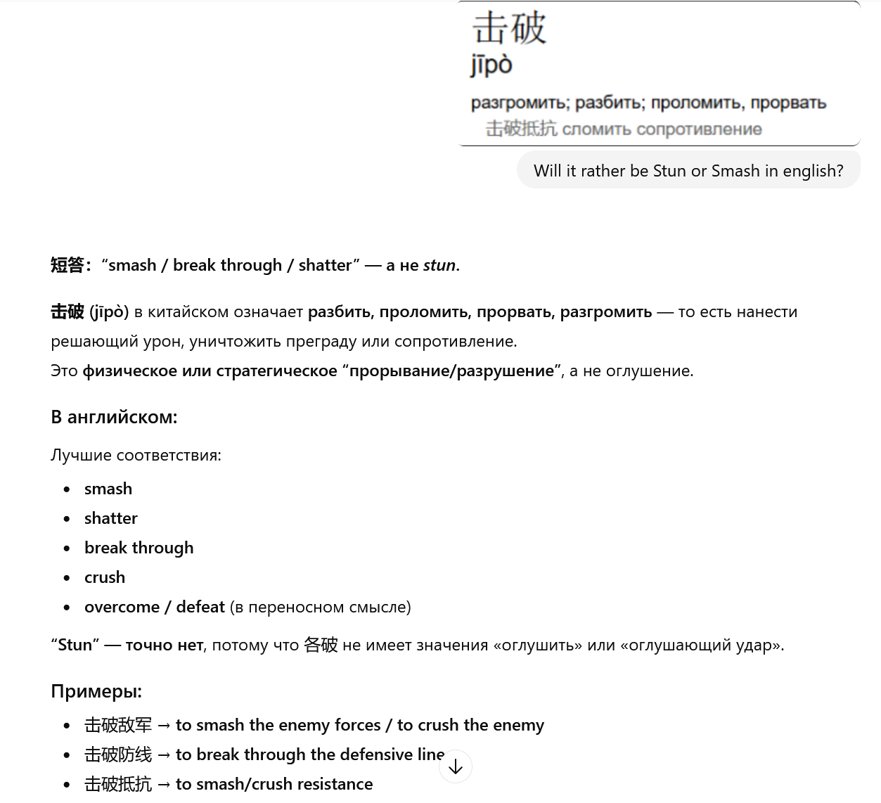 >>6043018 На моем скриншоте оригинальное китайское название. Не вижу в перечислении слова "оглушать" (to stun). Там вроде внятно написано "ломать оборону"