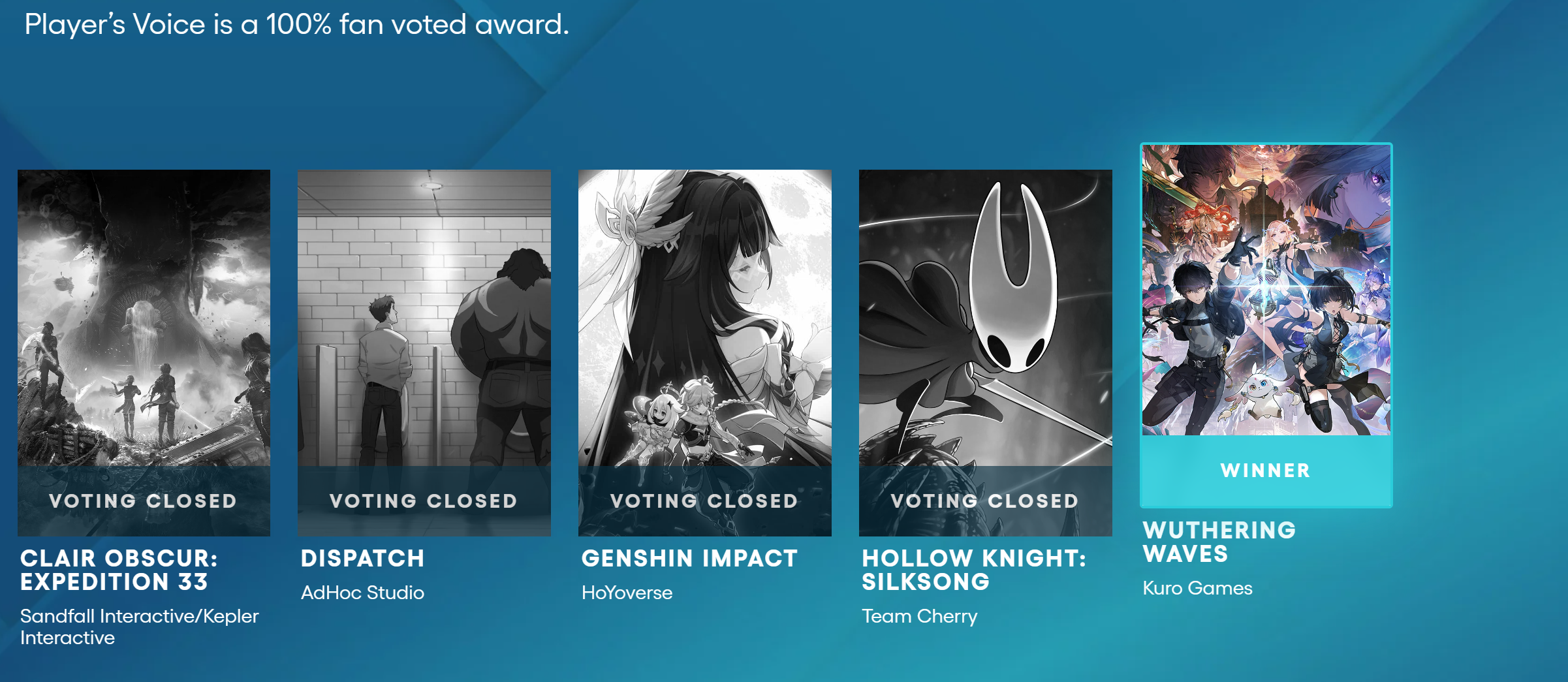 Поспрашивал задротов и разобрался. Слышали же про Hoyoverse? Ну у которых Genshin как денежный принтер. Угадайте-ка, Wuthering Waves это ещё один проект Hoyoverse. Игра выглядит как геншин, играется как геншин, обе гачи. Они придумали подставную контору Kuro Games по аналогии со своим вторичным офисом Cognosphere, чтобы избежать антимонопольных законов. Вот и постыдный результат. Обокрали нормальные игры, как обычно. Как только шёл новый раунд, В-С-Ё, тысячи лишних голосов за WW. Нет, простите, но лишь у одной студии есть такая армия ботов из игроков в геншин.