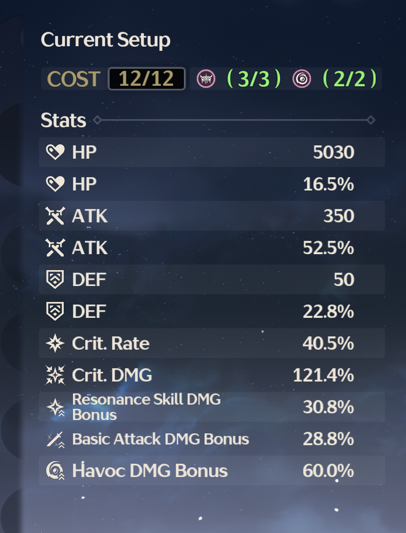 Пульсовый соратник: Атака увеличена на 12%. После нанесения урона врагу в состоянии [Вмешательство гармонии], бонус к урону от базовой атаки увеличивается на 6% в течение 3 секунд, суммируясь до 4 раз. Срабатывает раз в 0,5 секунды. Повторные срабатывания обновляют длительность. Звезда Бозе: Атака увеличена на 12%. После того, как персонаж в группе использует [Навык Разрушения Гармонии], его собственный бонус к атаке и урону от базовой атаки увеличивается на 12% в течение 14 секунд.