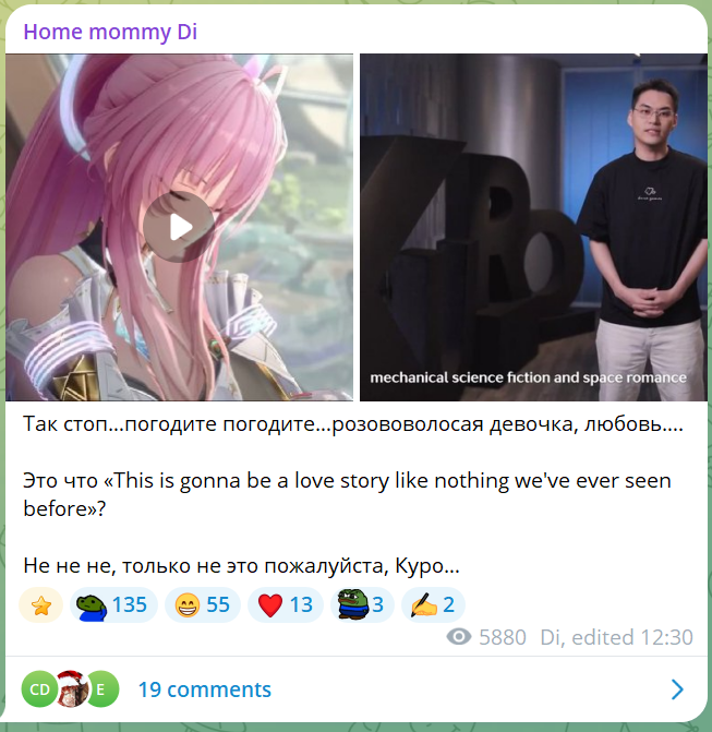 Гайс, хотел бы услышать ваше мнение кого крутить. До анонсиков думал Фросю с Кантареллой, обе нравятся, ну и для первой сигна мастхев как я полагаю. До этого крутил Чису, проиграл 50 на 50, по итогу выбил Фибичупи, потому что мне в тиму лучше заходит. Из Тим как раз Зани, Чупи и Верина/Шорка, и 2 - Августа, Юно, и Верина/Шорка тоже. Хотел выкатиться в хавок 2 персами, ровера к ним 3 поставить условно. Но после анонсиков... Захотелось Ринне (по японски понятно как её зовут, а на англе - Лини? Лайни? Лайне? Линае? Ляни? Лайнаи?), вроде по нахрюкам увидел, что подходит к Августе с Юно, если что - нового 2 перса с патча зароллить тоже не против. Эстетически Фрося с Кантареллой ближе, во 2 случае Ринне со значительно большим перевесом, чем вторая у меня. Сейчас у меня 50/50, со всеми фриспинами за награды 50 откручено. Если Некст патч ждать - всех спокойно ф2пшно с подпиской заберу, если сейчас роллить - донат за 7к минимум (мб в стиме карточки наберутся в сумме на такую сумму) и нет гаранта на некст патч. Ваше мнение?