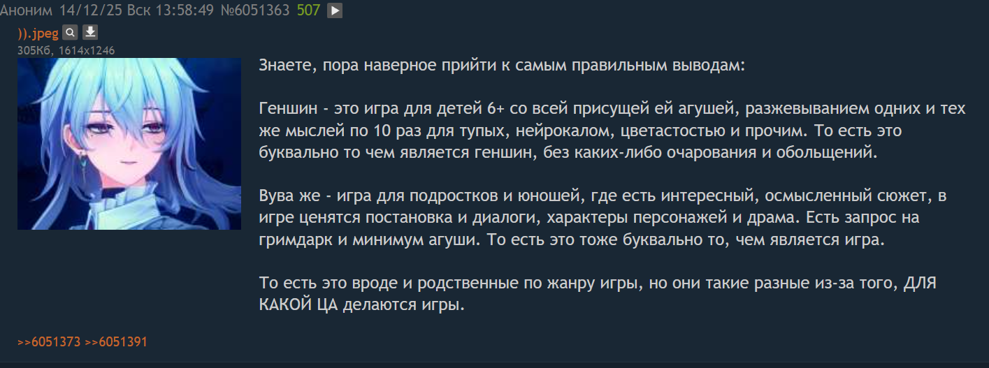 >>6050665 не воспринимаю геншин как адекватную игру. Это легкая и слишкому тупая игра. Если дота и кс заняли своё место как игры высшей киберспортивной лиги. Игры которые уважаемые так скажем простым обывателем, то геншин для мнения большенства - детская тупая игра не заслуживающая внимания. То же самое с атакой титанов. сейчас манимэ смотреть не зашквар, его смотрят или смотрели почти все. А атака титанов тупа самое популярное манимэ.
