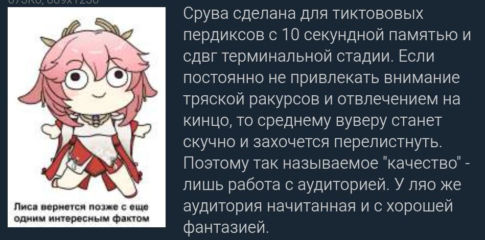 Знаете что такое реальное долбоебство кринжовое? Это когда скуф 40 лет аниме ушки оденет или костюм вентиля и будет к людям на улице приставать с вопросом: а вы любите геншин так же, как люблю его я?