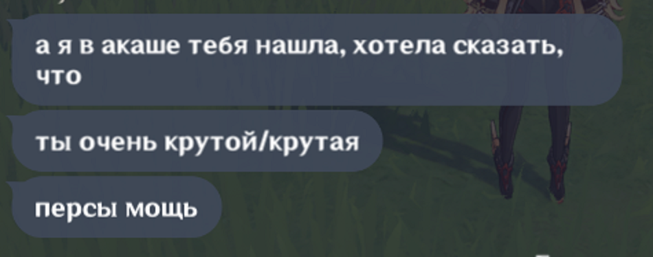 >>6050632 >>6050626 >>6050661 Она про Геншин знает немного, воспринимает нормально. На НГ дарила фигурки (озоновские простые, но всё же) с Фуриной и Райден. Так что с этим всё относительно в порядке. Промокод с Дуолинго, btw.
