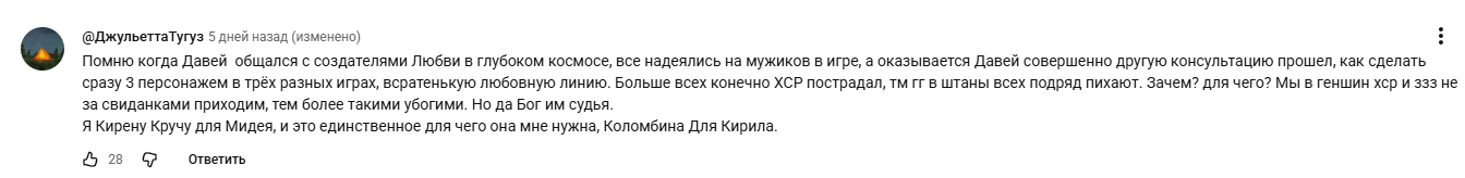 >>6056868 Все так. Поэтому я собираюсь протыкнуться коинфлипом в Варесу. А там как пойдет с Колумбиной. Сейчас чуть больше 40 круток в баннере. Накоплений ноль. Скорее всего заберу одну из них, если вообще хватит на вторую легу Просто напрягает сама мысль, что я заберу персонажа для двух тим на аккиче и буду играть одинаковым закокблоченным геймплеем до новой фулл пачки. Правда, неприятно что Кириллу запретили планжить, а у Нефер только 1 дамажная кнопка с единственным геймплеем через чарджи. Это конечно норм, но вот если контент как сейчас, когда я сотни раз ретраил бездну этой пачкой, просто чтобы выгулять разные варианты тим во второй половине, то начинает сильно напрягать