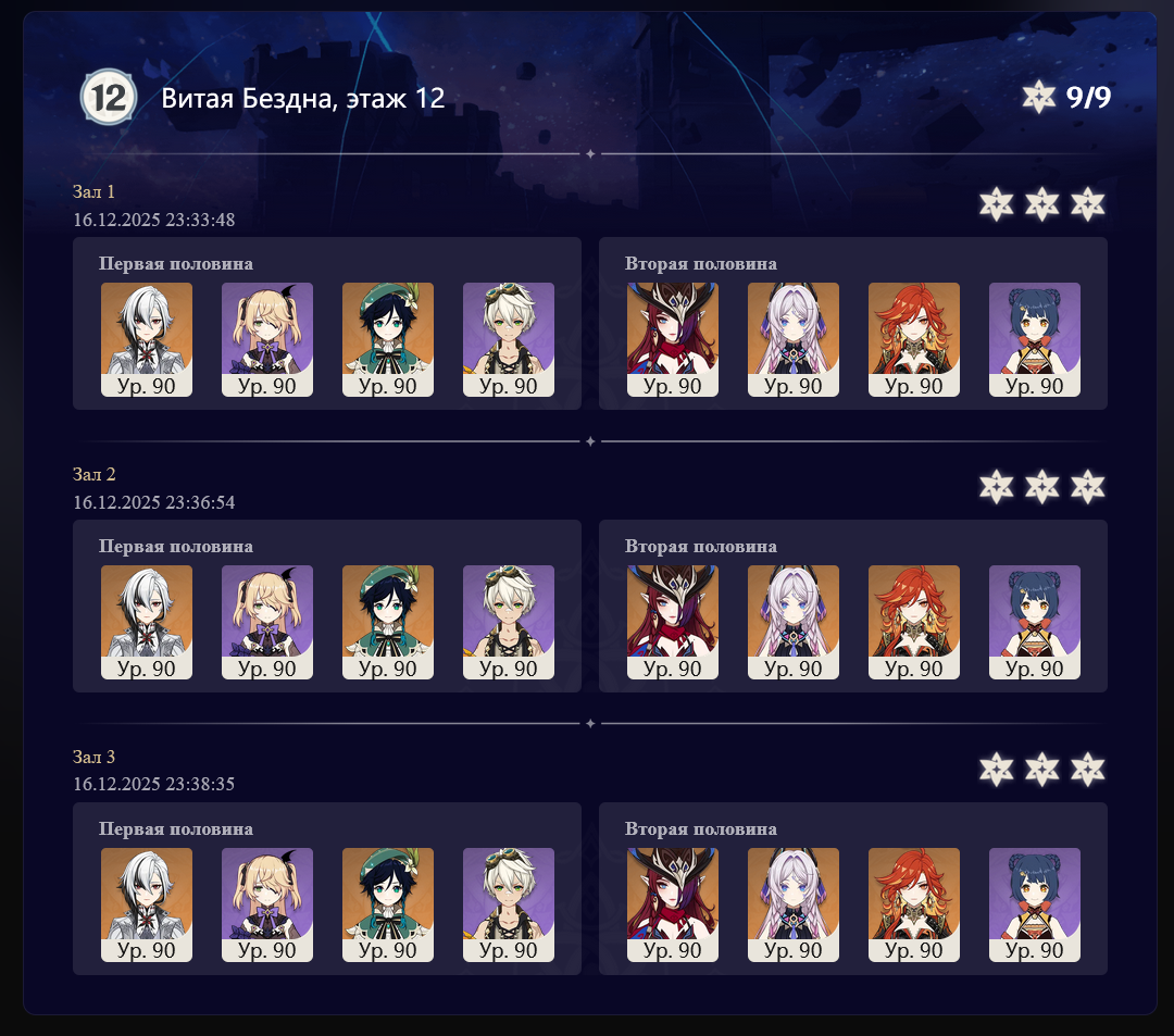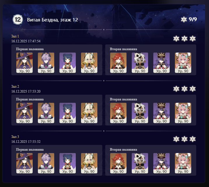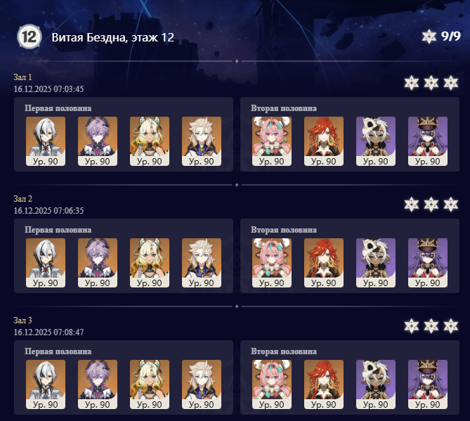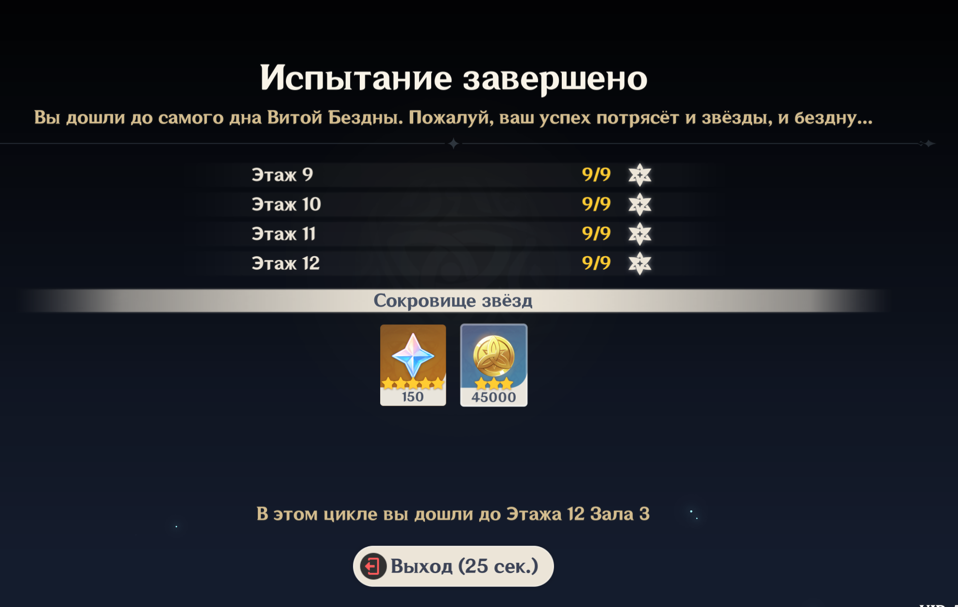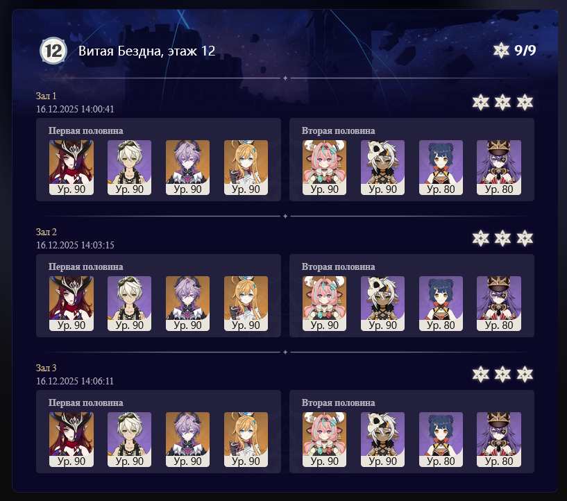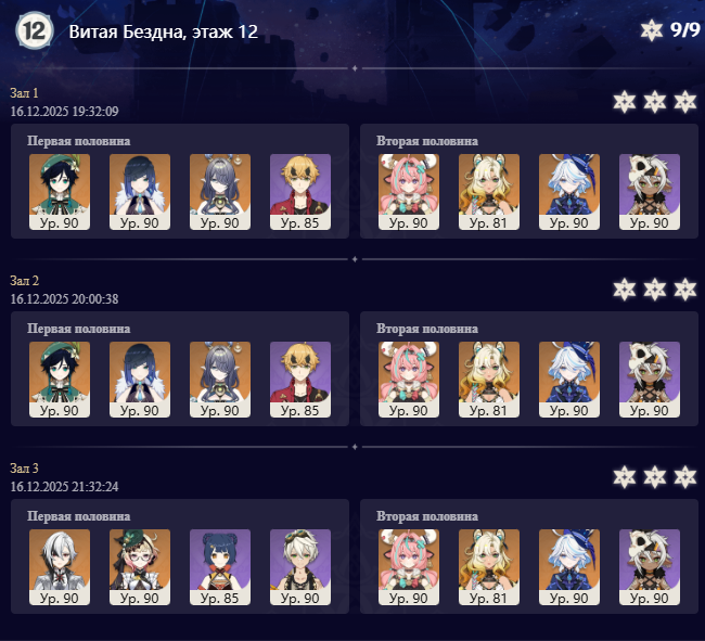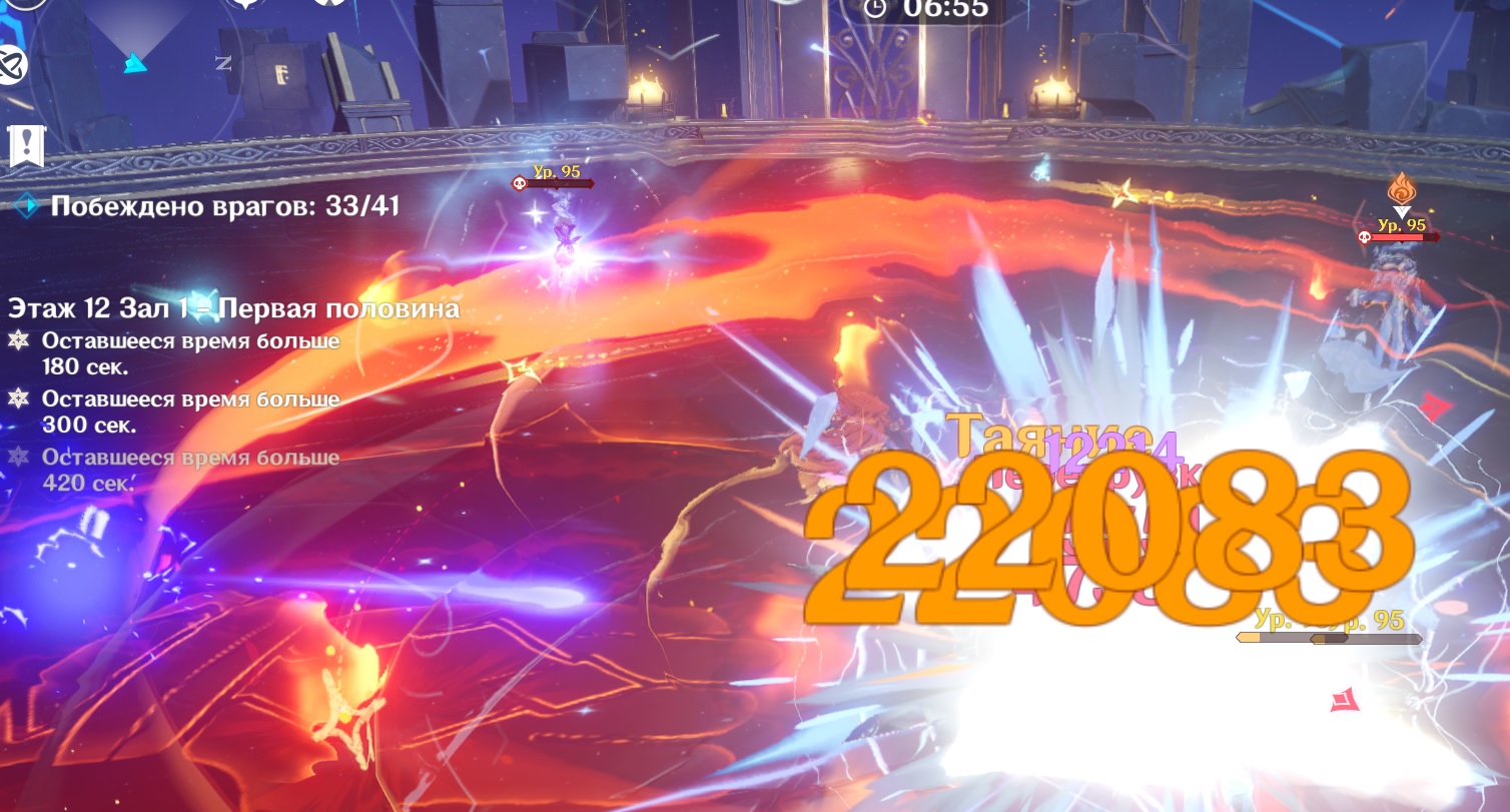 Пиздец, траил последний зал больше получаса. Так и не смог снести первому боссу все хп за один цикл, еле получилось добить через ульту Мявы в резист во второй цикл. Во второй половине Фишль сдохла в самом начале, пришлось без нее.