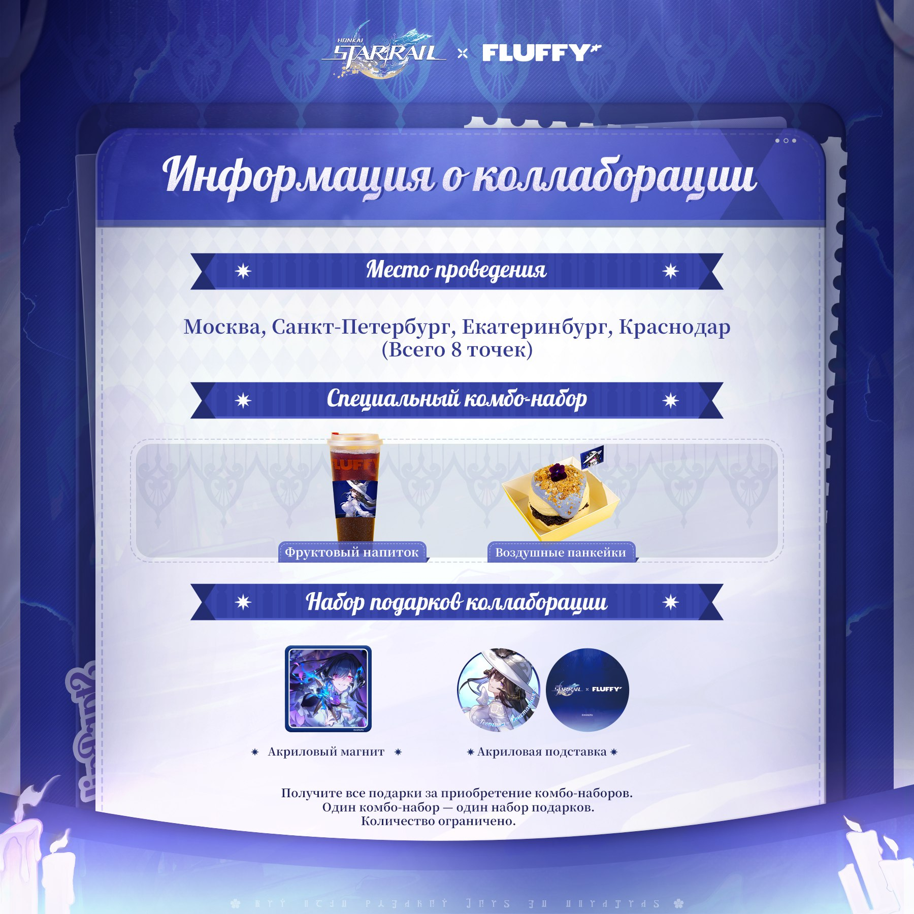 ✨ Специальный комбо-набор: воздушные панкейки и фруктовый напиток Цена: 1 500 рублей Набор подарков коллаборации: акриловый магнит и акриловая подставка.