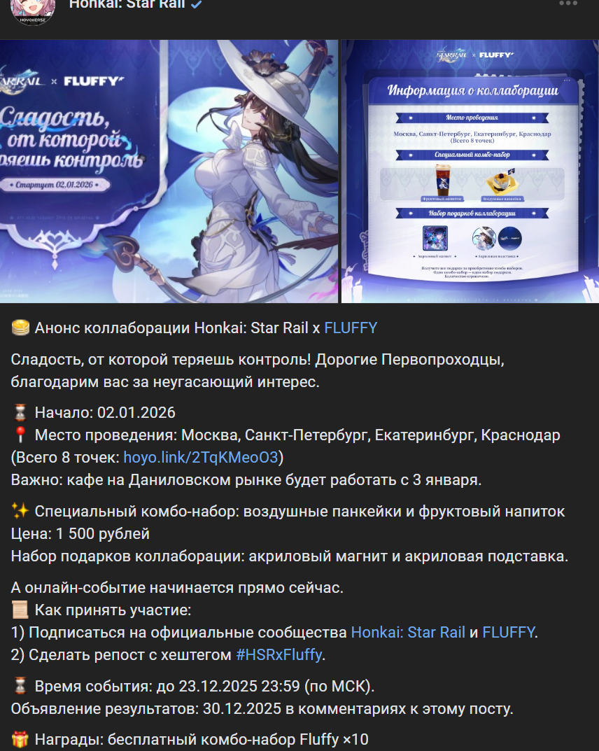 ⌛️ Начало: 02.01.2026 📍 Место проведения: Москва, Санкт-Петербург, Екатеринбург, Краснодар (Всего 8 точек (https://hoyo.link/2TqKMeoO3)) Важно: кафе на Даниловском рынке будет работать с 3 января.