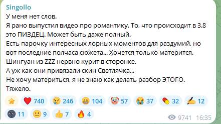 У меня нет слов. То, что происходит в 3.8 это ПИЗДЕЦ. Может быть даже полный. Есть парочку интересных лорных моментов для раздумий, но вот последние полчаса сюжета... Хочется только матерится. Шингуан из ZZZ нервно курит в сторонке. А уж как они привязали скин Светлячка... Не хочу материться. Тяжело.