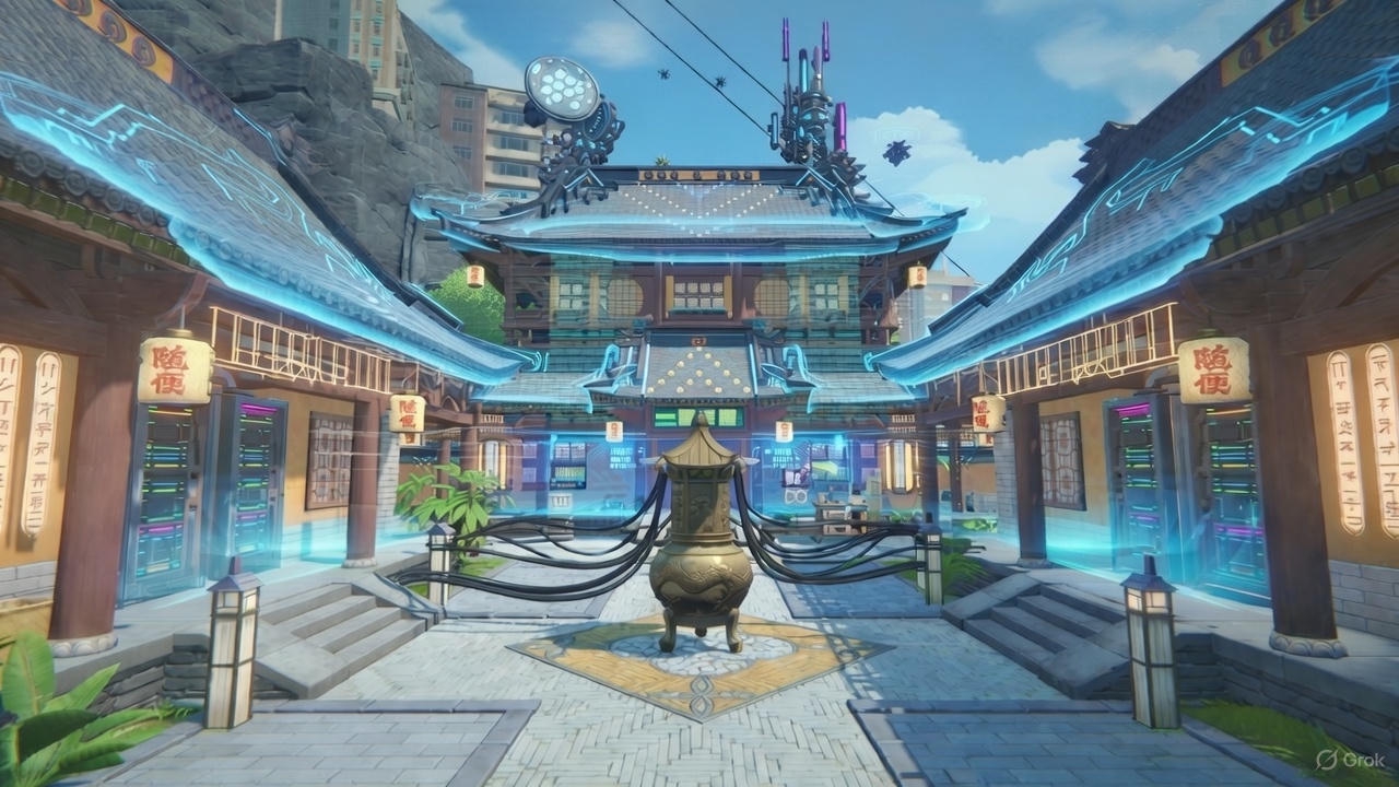 На затерянных улицах Файлюма, возвышается цифровая святыня — Техно-Храм «Небесный Код». Это серверный комплекс, испещрённый голографическими мандалами и светящимися линиями сакральных схем. Его шпили — это антенны, ловящие эфирные сигналы «Эфира». Его алтарь — центральный процессор, где монахи-кодеры медитируют, расшифровывая поток данных, пытаясь найти в нём следы утраченного «старого мира» и предсказать аномалии в Кавернах.