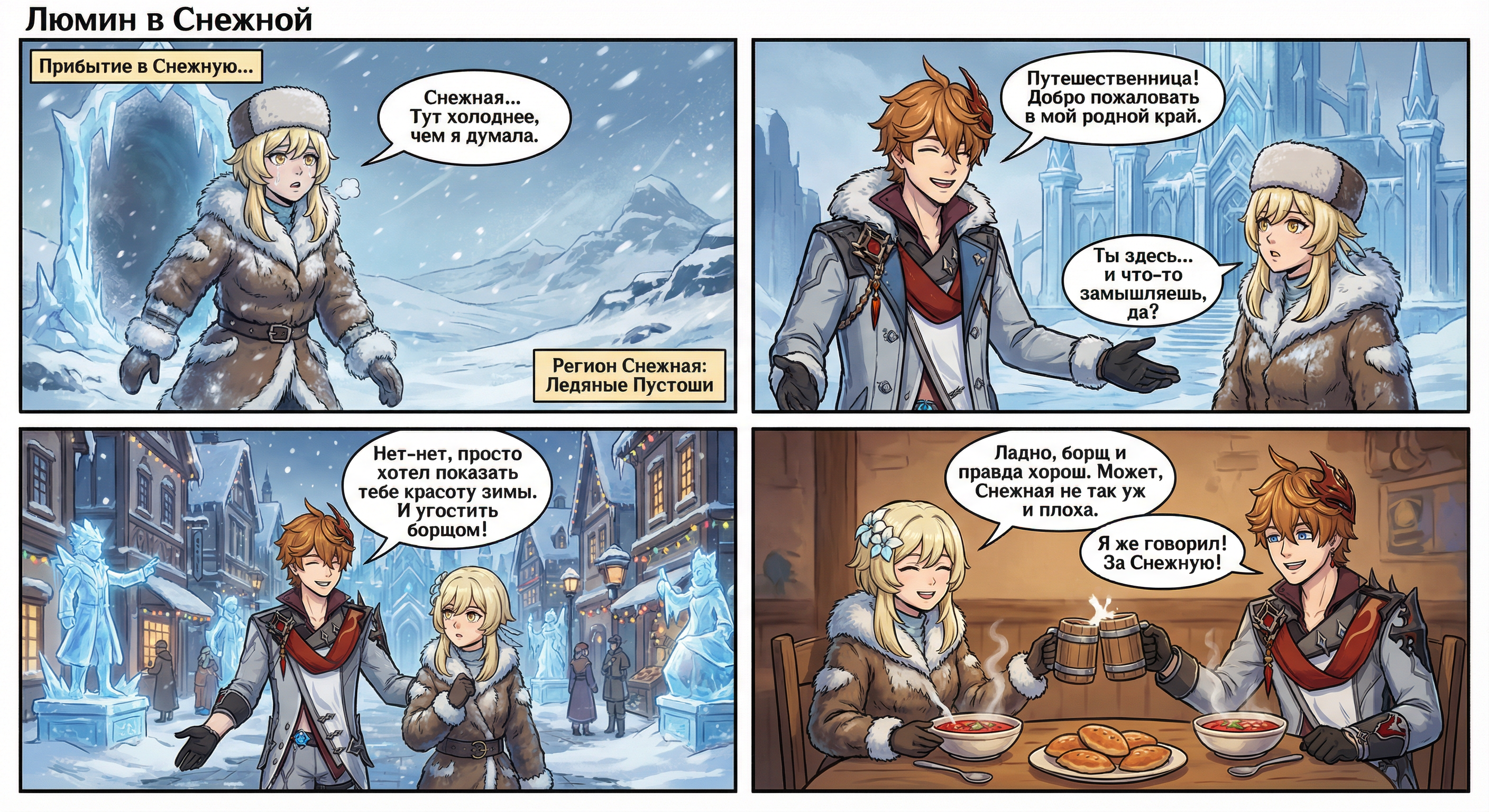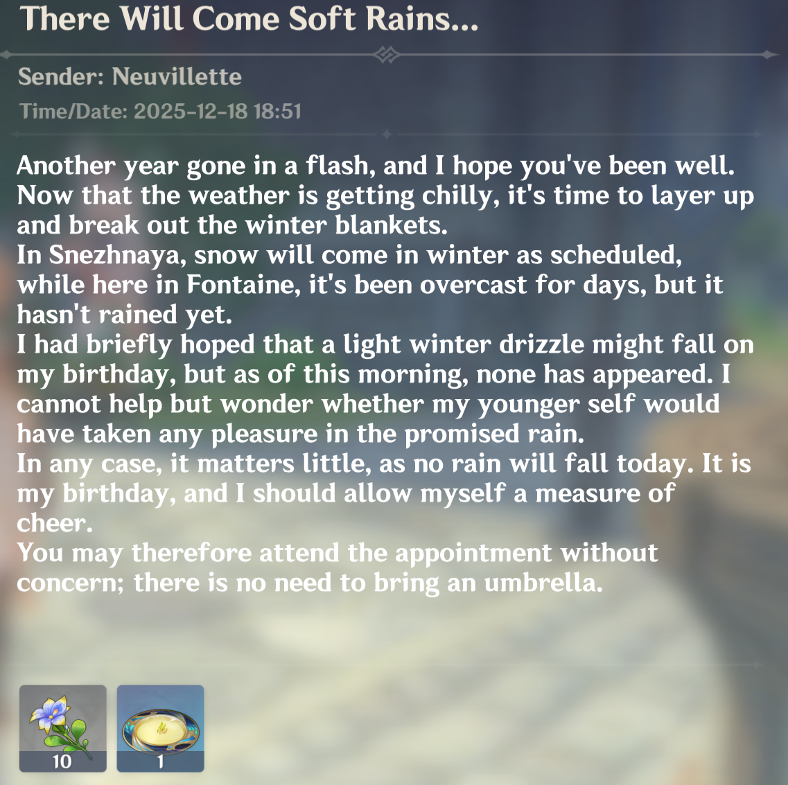 - Дорогие тейватцы! Дорогие жители! Заканчивается 2025 год. Этот год был непростым для вас. Непростое экономическое положение, повышение цен и тарифов, неожиданные финансовые трудности и проблемы, связанные с банковской сферой, Фатуи – все это коснулось почти каждого из вас. Я бы мог сказать, что наступающий 2026 год будет лучше, что он принесет нам экономическое улучшение и потерянную стабильность. Но я не буду обманывать ни вас, ни себя…