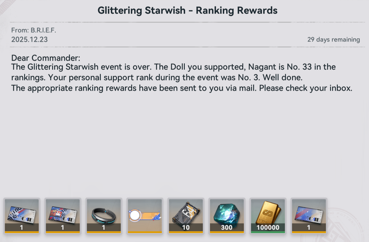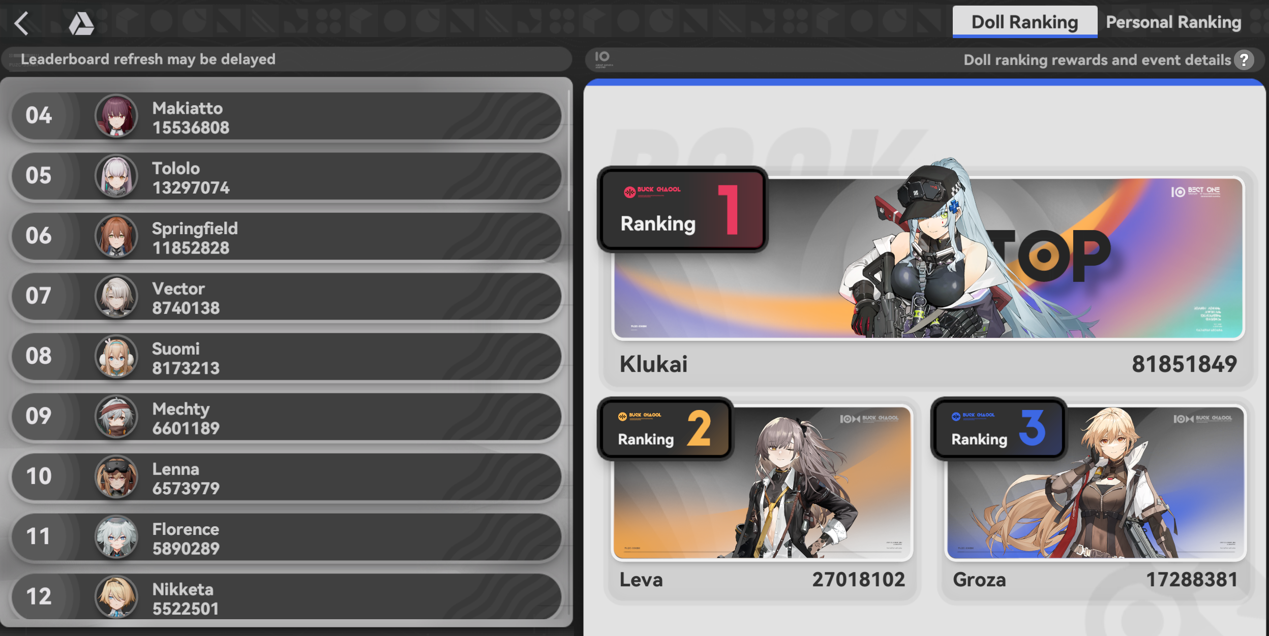 Руководство Санборн крайне довольно результатами первой части текущего эвента на Китае, только за первые 2 недели они собрали денег примерно столько как за последние 3 месяца вместе взятых. На Китае примерно 40% ушедших игроков вернулись обратно в строй! Следующая кукла Блек гроза, но перед ней будет еще одна очень знакомая всем кукла по предыдущим играм с особыми механиками. Блек гроза выйдет на китайский НГ вместе с еще одним крупным эвентом по размерам сопоставимым с текущим. Для китайцев будет особая программа празднования их НГ. (Стримы дорков и специальный стрим разрабов)