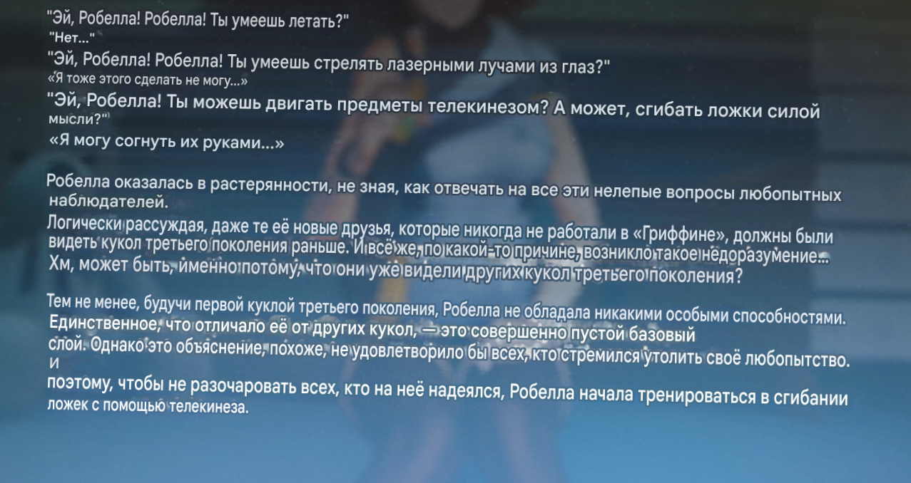 >>6111170 У нее нейронку заело на бытие гадалкой и гадании из-за пережитого опыта. Подробнее можно почитать в ее пыльном журнале, он там один из первых. Там заодно подводки к ее возможной будущей сюжетной арке. Изначально кстати, когда она только прибыла на Эльмо, она разговаривала нормально, со слов Шкикана. И в сюжетке было пару раз, когда она нормально проговаривала некоторые фразы, чтобы подстебнуть Кролика.