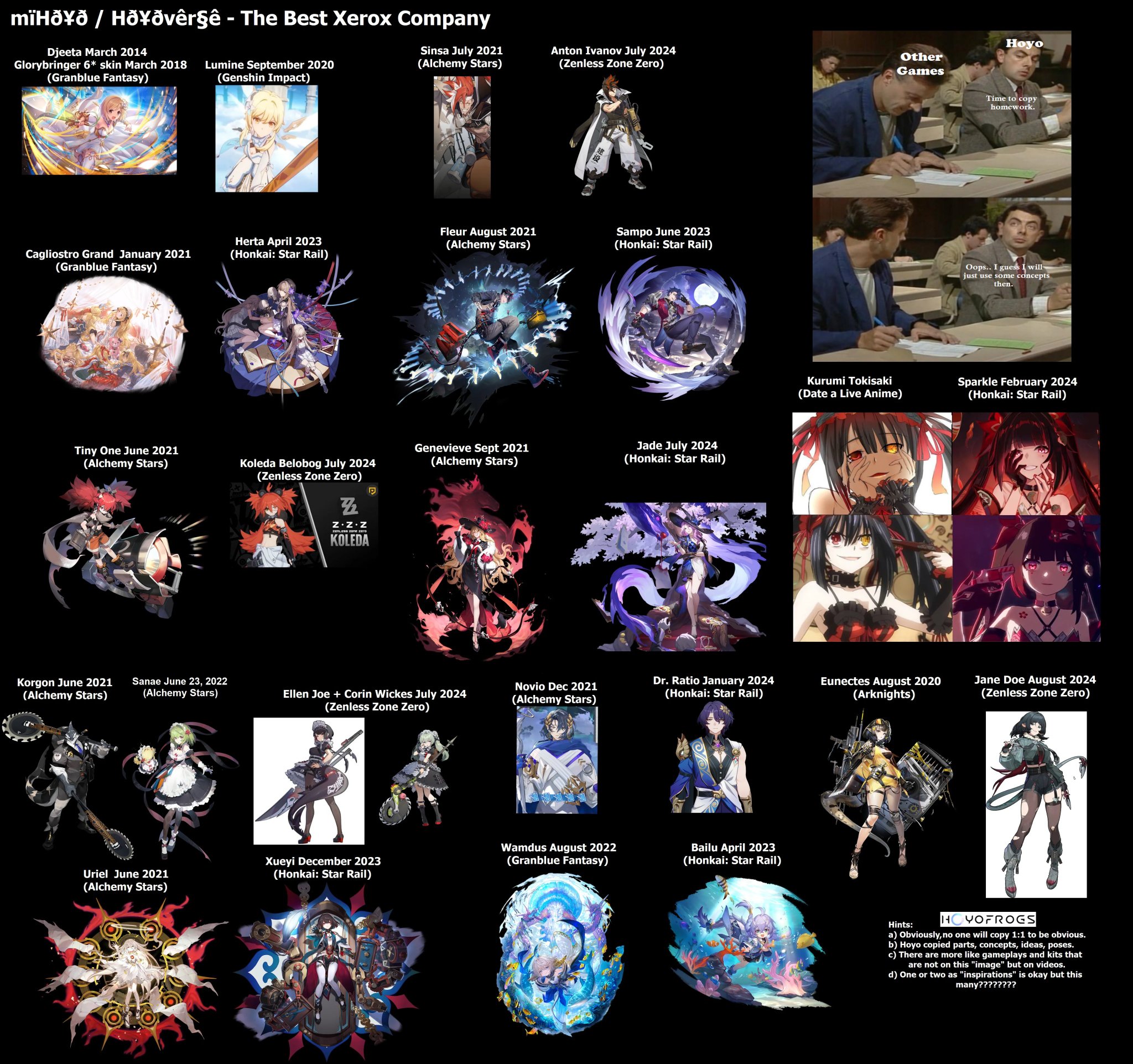 >>6080239 Доёбы как у худов в твиттерах - "ты спиздил мой дизайн, уа, вор!"ю И ладно бы чтобы всё было как в случае с Джо и робосудьи с лофу - там прям трейс позы - но всё остальное это буквально доёб по подозрению в слизывании дизайна, хотя это уже блять чуть ли не аниме архитипы.