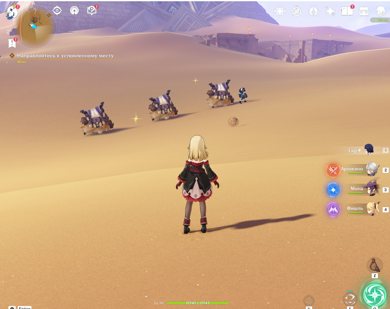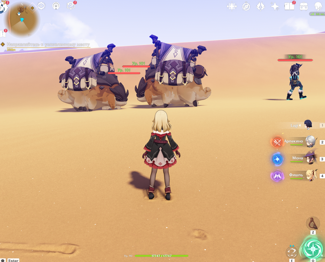 Месяц назад я наткнулся на эту ситуацию в пустыне Сумеру и заскринил. Она мне показалась забавной: идёт одинокий солдат фатуи, явно задание какое-то - караван вести. И так тяжело: жара, Солнце, песок, опасность пустынников... А тут ещё вот такая проблемная ситуация. Один баран почему-то развернулся и пошёл бодаться сзади идущим бараном. И вот стоят они, мычат, бодают друг друга, а солдат даже не заметил потери каравана.