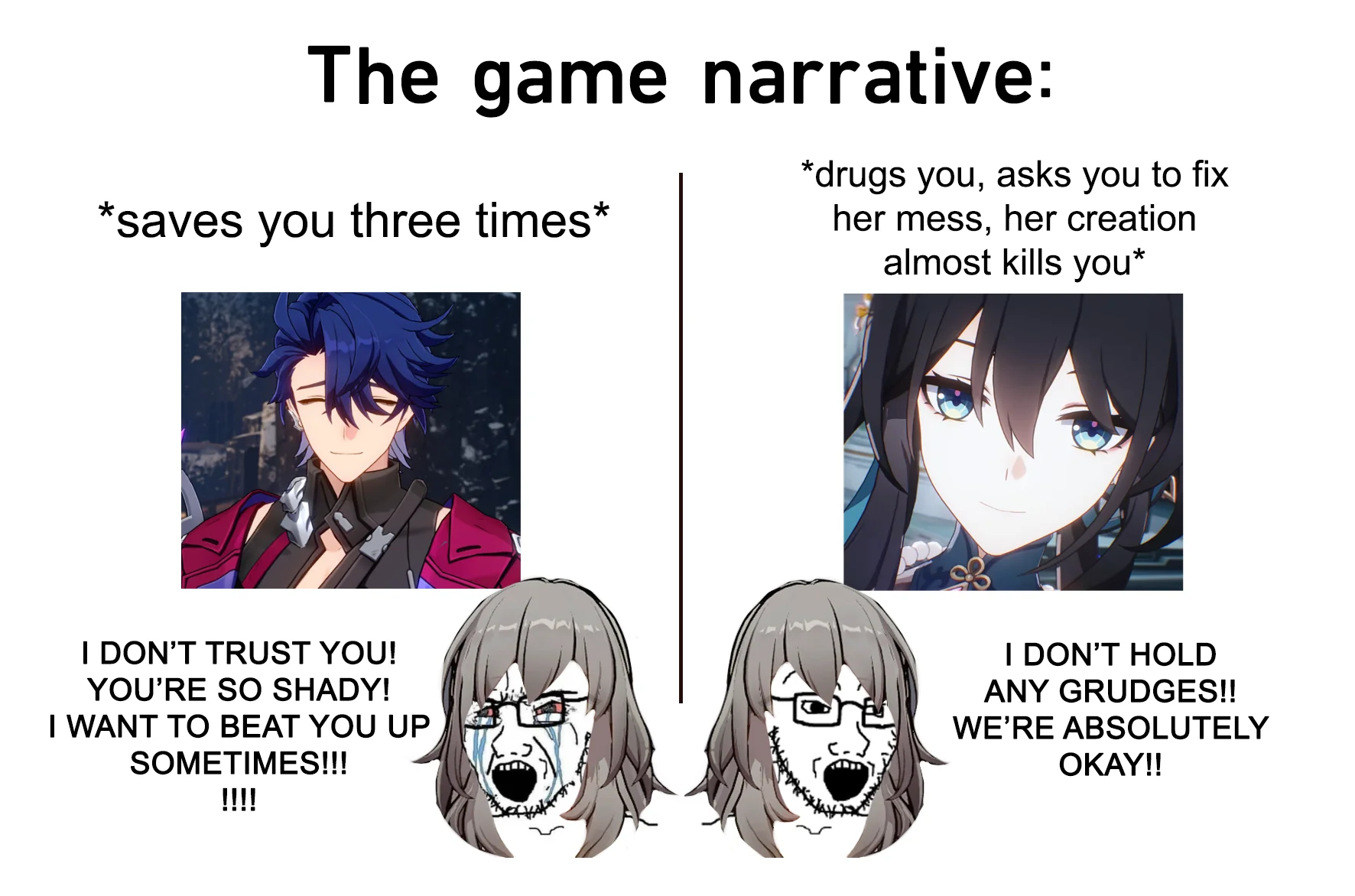 >>6079834 >не та тня This. У людей разные вкусы, и когда им насильно пихают в ебало определенный архетип в качестве главной вайфу, это начинает сильно раздражать. Может, я в конце игры вижу рядом с собой Кафку, или Волка, или вообще Сервал. С хуев я должен благодарить Шаоджи за навязанную мне бабу? Опустим нюансы, что она вообще в сюжет топорно была впихана, кому-то такое норм, спорить не буду, пусть так. Но с хуев я должен умолять Терминуса ее спасти? Может, мне вообще похуй на всю вселенную, кроме изначального каста экспресса? Может, я вообще хотел бы заебашить всех охотников за стелларонами и считаю их всех преступниками, не достойными жизни? Ну ладно, последнее в гаче от хуйланов невозможно, мы по умолчанию всегда Иисус всепрощающий, но энивей, тогда не нужно делать вид, что гг это мы, назовите гг Шаоджи и рассказывайте историю от его лица и виденья, у меня не будет вопросов, почему моя любимая тян была забыта и вообще не имела романтика, а Светлячка осталось только в свадебное платье нарядить.