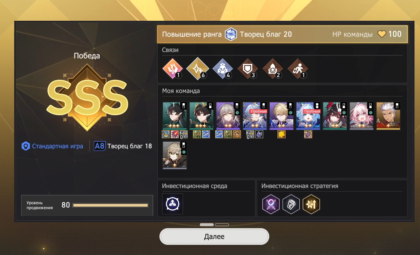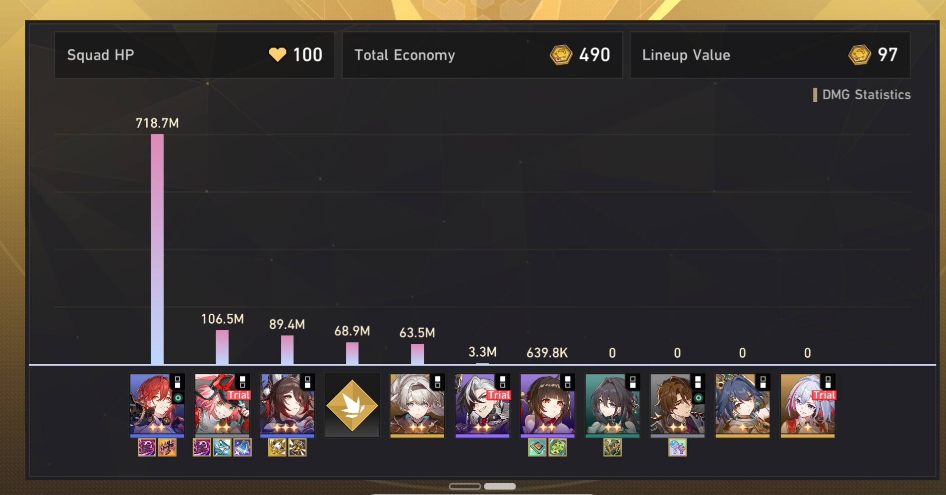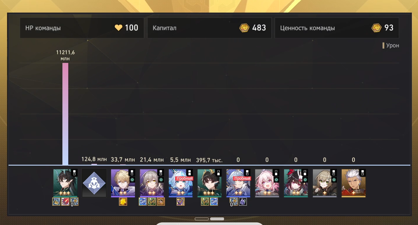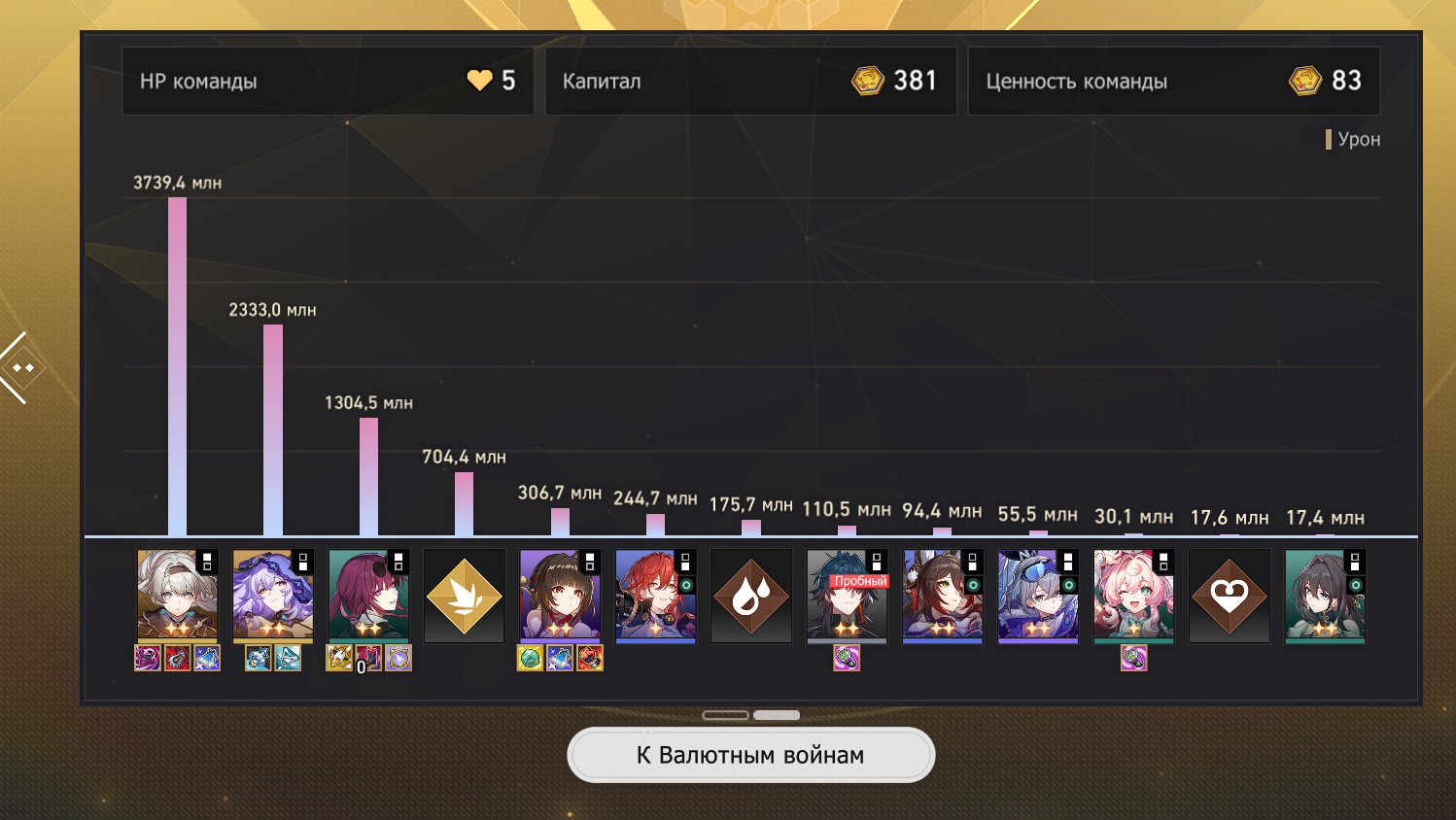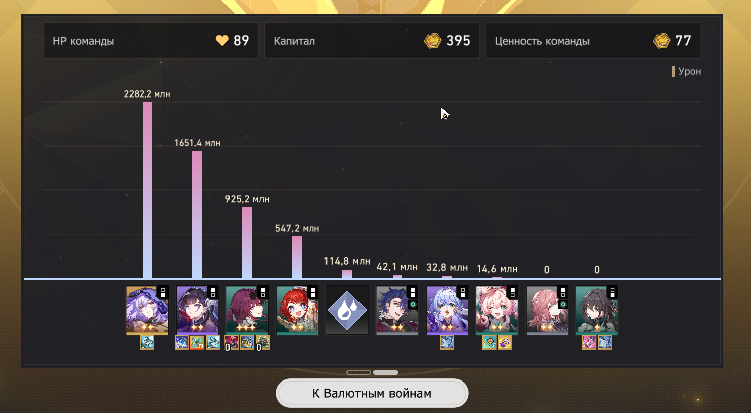 Ну что же, добрались руки допройти Валютные Войны. Из принципа не стал пробовать метовые команды вроде Аглаи, Фаэнона, Анаксы, потому что всё равно на аккаунте нет своих персов. Пробовал Ахерон+Турбопела, но не совсем моё было. Как будто чего-то не хватало.