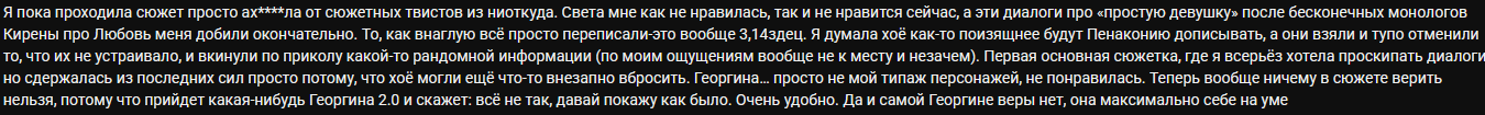 3.8 лучший патч за всю 3.0, даже не скипал диалоги на моментах со Светой. Вспоминаю начало 3.0 с грекокалом, ещё до введения скипа диалогов, и в холодный пот бросает, проходил сюжетку в то время кликая пальцем по перевёрнутому экрану телефона по пути домой с работы в метро. От новой сюжет очень приятная ностальгия по тем временам, когда не было ебейшего крипа и была свобода в пачкостроении, когда ещё так явно не ощущалось во что превратится игра.