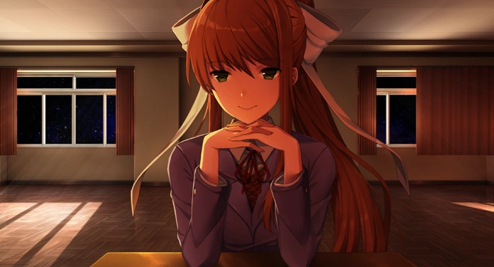 “Да, вот так! Снова привет, [PlayerName]. Эм... добро пожаловать в литературный клуб! Разумеется, мы уже знакомы, ведь в прошлом году мы были в одном классе и... эм... А-ха-ха... Знаешь, на данном этапе мы, наверное, можем пропустить всю эту ерунду. В конце концов, сейчас я разговариваю не с этим человеком, не так ли? Под "этим человеком" я подразумеваю тебя в этой игре, как бы ты там себя не называл. Я разговариваю с тобой, [PlayerName].„