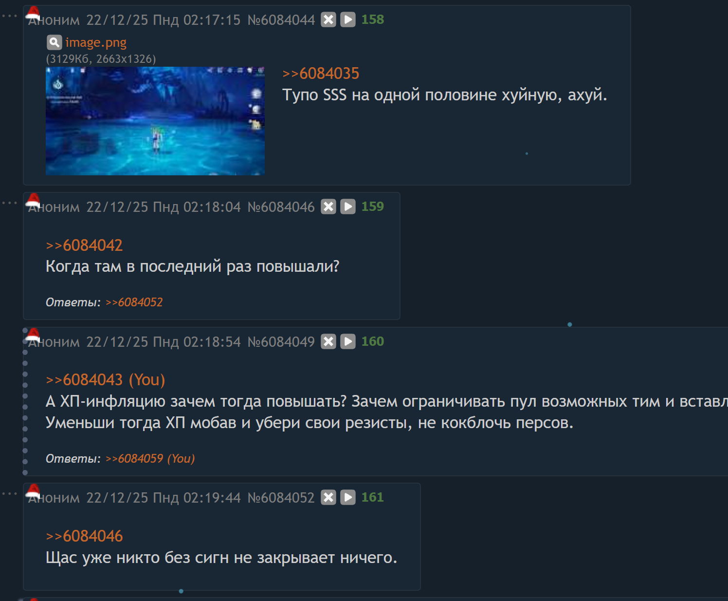 В попытке увести тему от трусов и сои... Далее моё личное мнение, я знаю что в треде большинство будут не согласны. Сейчас делаю последний акт ринаситы (который 11й), и это пожалуй самый унылый главный квест который я когда либо делал, даже унылей всего, что я видел в г импакте (без преувеличения). Почти весь квест нажимаешь "вперёд", даже QTE половину можно не нажимать потому что нет фейл стейта, умереть нельзя потому что бессмертие с 1хп. Это унылота уровня "мобильная поделка для толчка", вот как для детей делают игры где, как завещал то ли дэвид гэйдер то ли кто там, "press a button and something AWESOME happens", вот это акт 11 Новогодней радостине только 11й на самом деле, но для этого тред ещё не готов. Когда тут писали "АХУЙ" я не думал что это на самом деле "жмёшь одну кнопку и на экране появляются яркие вспышки".
