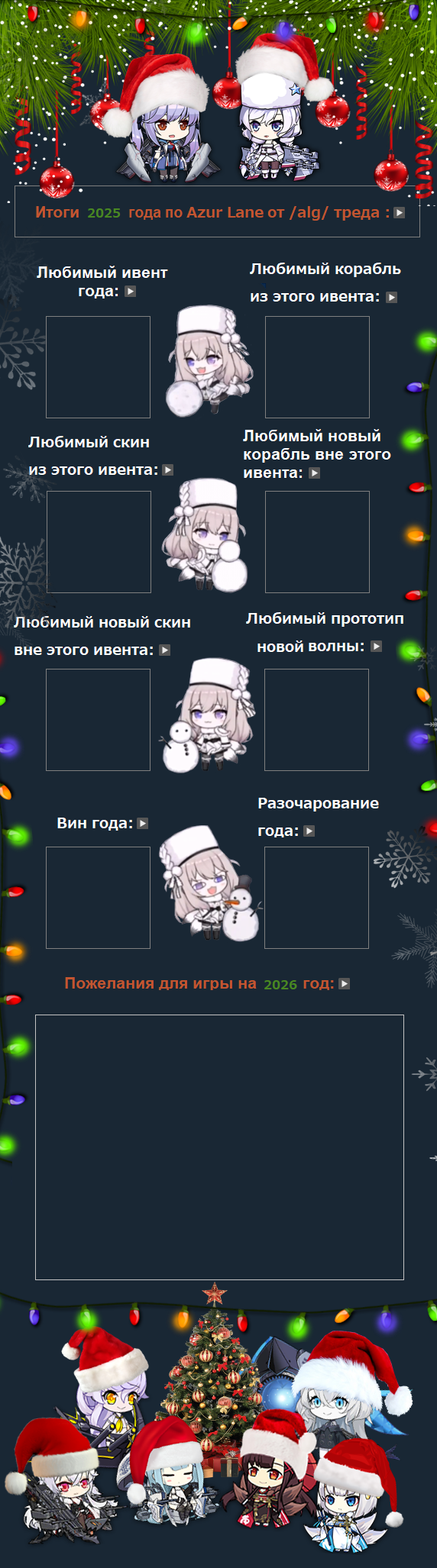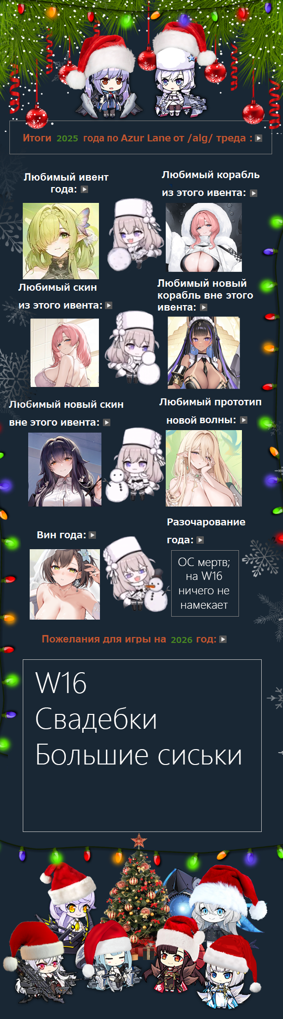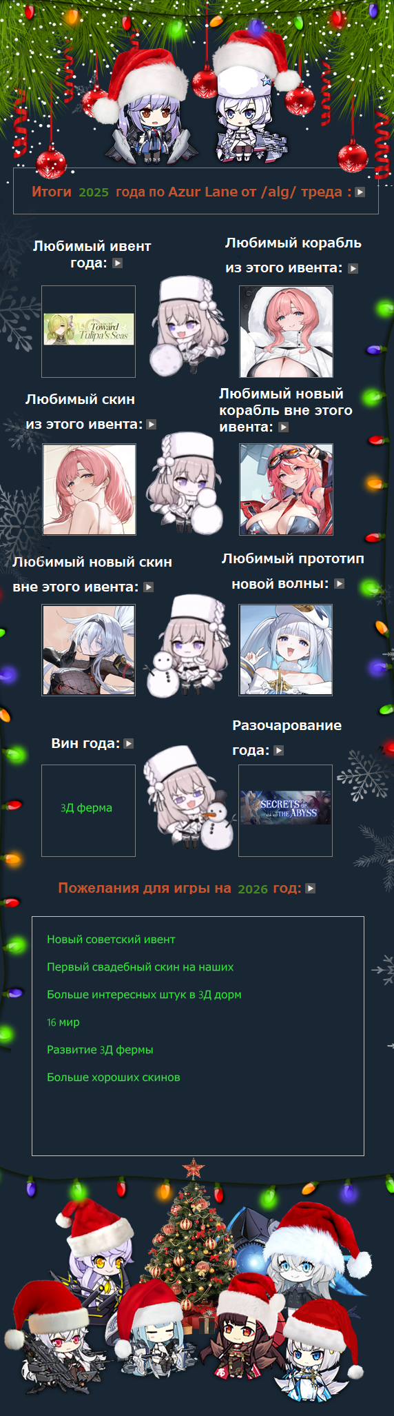 Это чипсиковый десант! С Новым Годом шкиканы! Если бы не вы, нас тоже не было бы. Сам играл в Азурку 2 года до ушек, Белфаст и Тайхоу навсегда в сердечке, до сих пор артики с ними регулярно смотрю, и просто все новые шлюпки рассматриваю, рад что вас все еще кормят самым отборным 2д мясищем для плапания! Удачки и счастья вам!