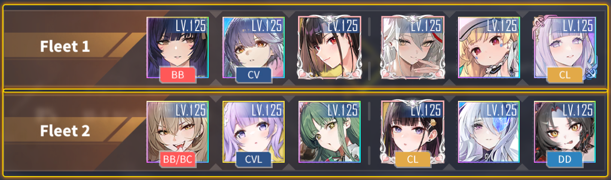 Я вот этим закрыл на автобое, один флот (второй который с мушаши) прошёл все ноды для 3* и убил боса. Пулю подбирать, когда останется джва моба и босс, чтобы боса катать без дебафа. Флит один вообще не трогал, но при желании можно для облегчения убить пару ББ мобов с тремя звёздами, но только вручную, на авто их прокатают (надо канселить залпы ББ ударами авиации), потому что нету хила.