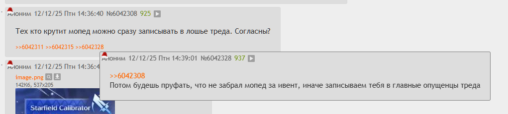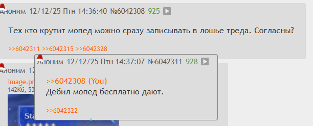 >>6099366 >>6099360 >>6099355 >>6099345 >>6099340 Но ведь на картинке тут >>6099335 это ответы к посту про тех кто "крутит мопед". Логично предположить, что крутят чемпика с мопедом. Либо вы ебанаты, либо ебанаты отвечавшие на картинке. Ну скорее всего и те и те конечно.