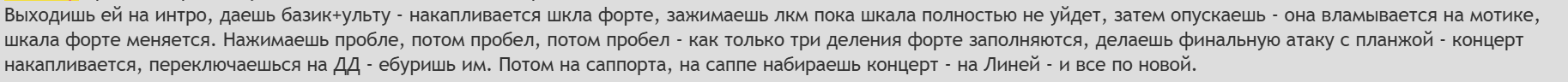 >>6100155 Писевор просто насрал дохуя, но там на самом деле все просто. Выходишь ей на интро, даешь базик+ульту - накапливается шкла форте, зажимаешь лкм пока шкала полностью не уйдет, затем опускаешь - она вламывается на мотике, шкала форте меняется. Нажимаешь пробле, потом пробел, потом пробел - как только три деления форте заполняются, делаешь финальную атаку с планжой - концерт накапливается, переключаешься на ДД - ебуришь им. Потом на саппорта, на саппе набираешь концерт - на Линей - и все по новой.