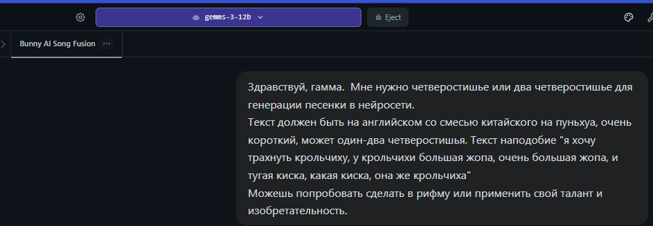 Только дошли руки... Я уверен, что тексты песен генерирует нейросетка. Нейросетка делает это слишком "изобретательно", зная несколько языков лучше их носителей, при этом соблюдает рифму, и перескакивает с языка на язык свободно. Это жесть. Жаль локальной нейронки для генерации песен нормальных нету, только корявенькие.