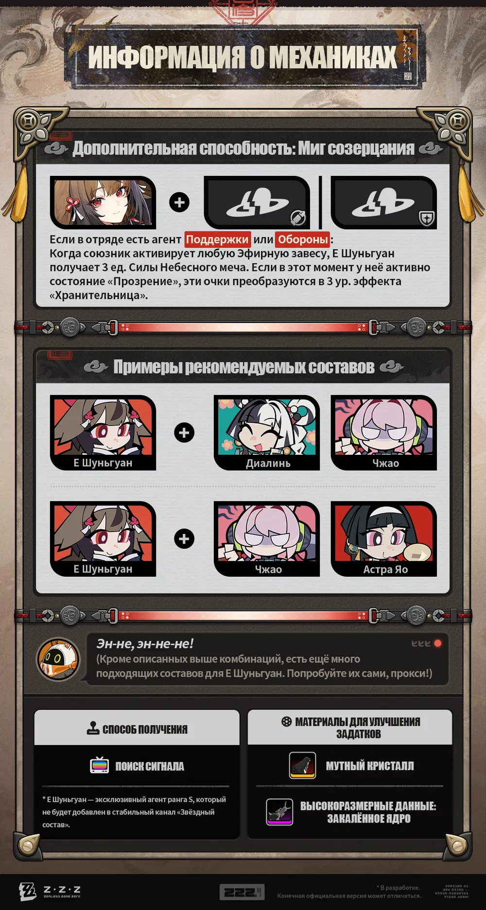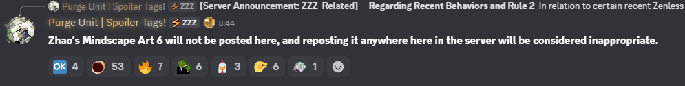В отношении некоторых недавних персонажей Zenless Zone Zero уже применяется следующая модерация: Предупреждение участникам сообщества, которые: (1) делают неприятные комментарии в адрес определенных персонажей; (2) используют определенные реакции, например, посты об определенных персонажах; или; (3) публикуют фотографии с двусмысленными ракурсами или обрезанные изображения определенных персонажей. Речь идет о Чжао и любых членах Angels of Delusion. В настоящее время, после недавнего выхода Mindscape Art с Чжао, подобное поведение стало наблюдаться еще чаще, поэтому мы хотим еще раз подчеркнуть и прояснить для всех: Публикация Mindscape Art 6 с Чжао сама по себе будет считаться неуместной и противоречит вышеупомянутому поведению, нарушающему правила, и при необходимости будут применяться предупреждения или временные блокировки.