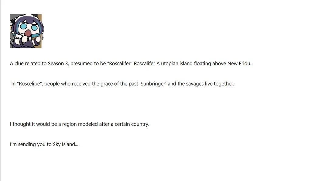 Бля, неплохой сюжет для Зетки в треде вырисовывается, даже интересно стало. Жаль в игре такого не будет. И это не остров с илитами, а колаба с Гавнишем и просто летающий остров Нингуан на котором она прилетела в Файлюм заключить контракт и наладить поставли люмокерама в Ли-Юэ