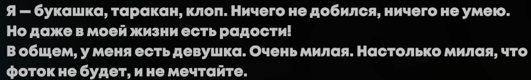 >>6116487 В каком месте она пикми, если она не врет что ей нравятся мужские хобби и она не говорит что она не такая как все чтобы понравиться всем мужчинам? Алло блять, это фор ю фансервис, такого тут не будет никогда.
