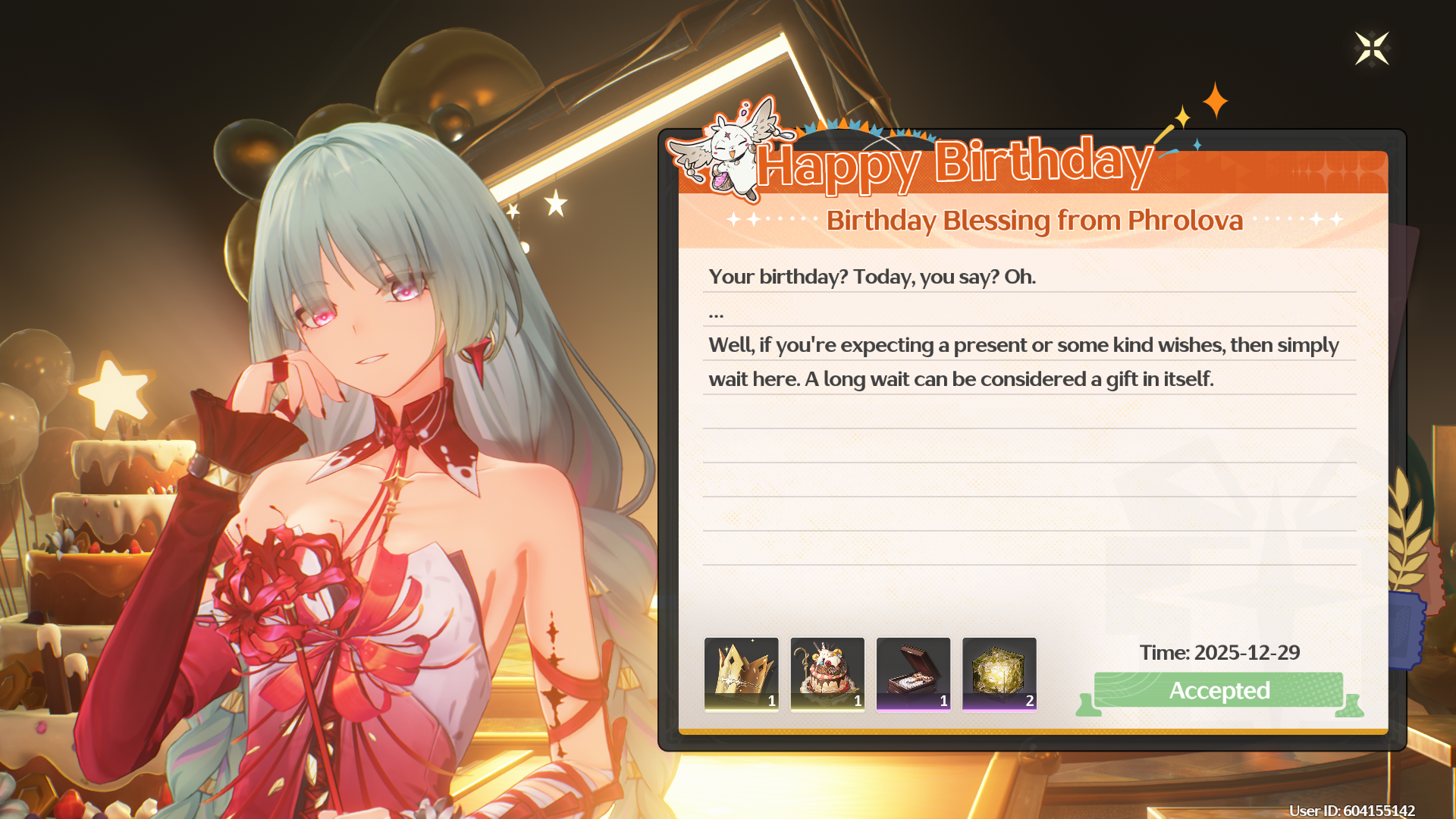 Собственно запись по факту получения. С вас скрин девочки, желательно в меню с цепями(это облегчит мне работу), и если выбили волшебную палочку, то с ней тоже скрин. Юид можете замазать кроме 4-х последних цифр.